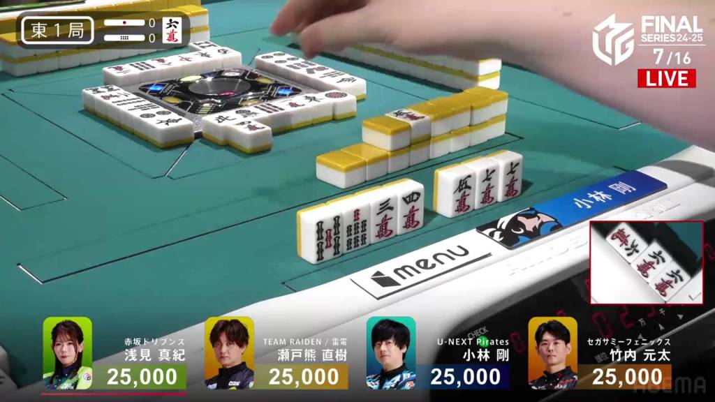 At the start of the second row, Kobayashi is the first to tenpai and gets to tenpai on a 6s kanchan.