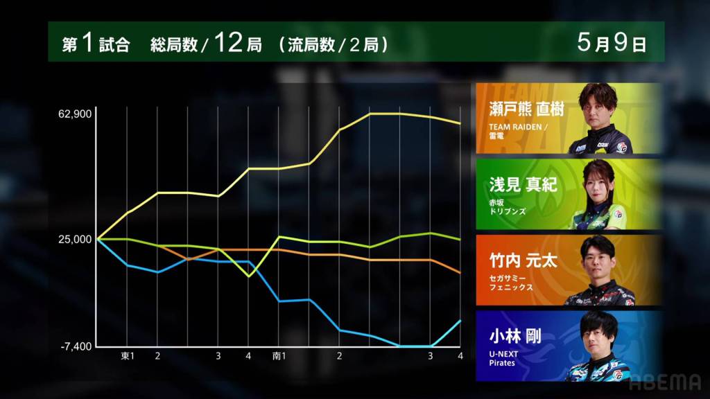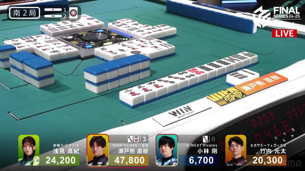 In S2-2, Setokuma is now the dealer and has almost double the score of 2nd place. A riichi stick and honba sit in the middle.