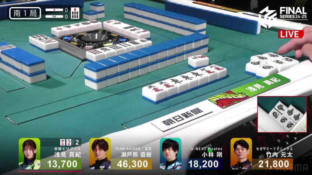 Within the ippatsu round, Setokuma gets to tenpai, discards the dora 1p and calls riichi on a 36p ryanmen. If either Genta or Asami discards the 3p, Setokuma would win on headbump. In the third row, Kobayashi draws and discards the 6p and deals into Setokuma. Setokuma wins the hand with Riichi/Tanyao/Aka 1 for 7,700+600 plus two riichi sticks, taking Setokuma up to 58,100.