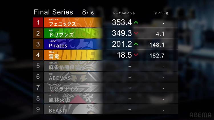The Sega Sammy Phoenix have a very slim lead over the Akasaka Drivens. The U-Next Pirates are still within range of 2nd place, but are also in danger of dropping down to 4th place with the competitive Team Raiden.