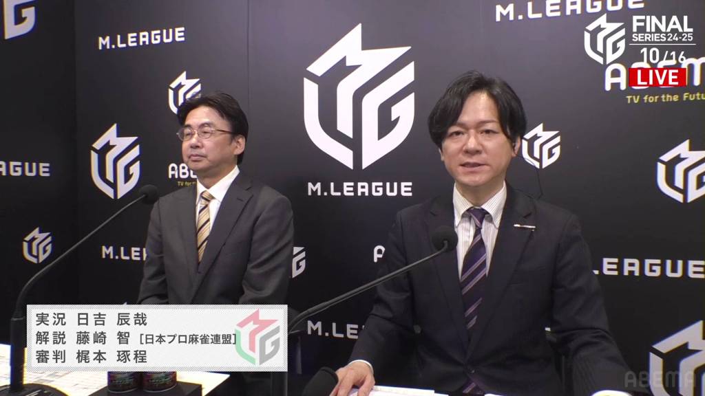 The commentators of the day were Hiyoshi Tatsuya and former Konami Mahjong Fight Club player Fujisaki Satoshi.