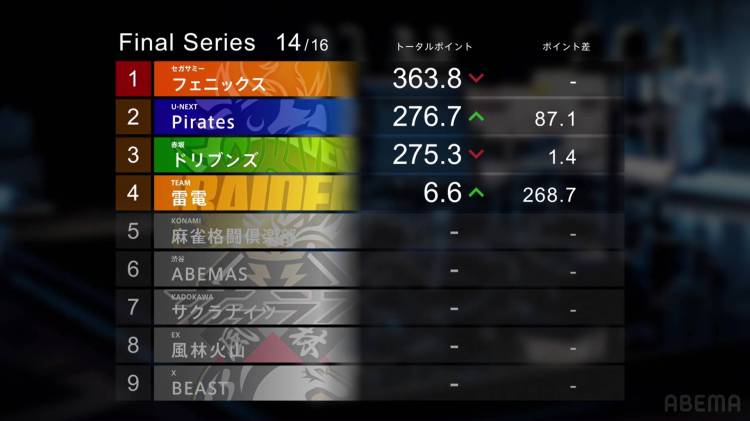The Sega Sammy Phoenix hold an 87.1pts lead over the 2nd place U-Next Pirates, with the 3rd place Akasaka Drivens not that far behind them. A big 1st place by either the U-Next Pirates or the Akasaka Drivens could put them on top. Team Raiden in 4th place and 268.7pts behind 3rd will need get a big win as well and do some targeting.