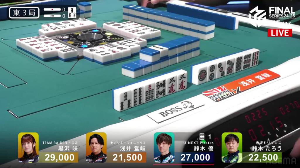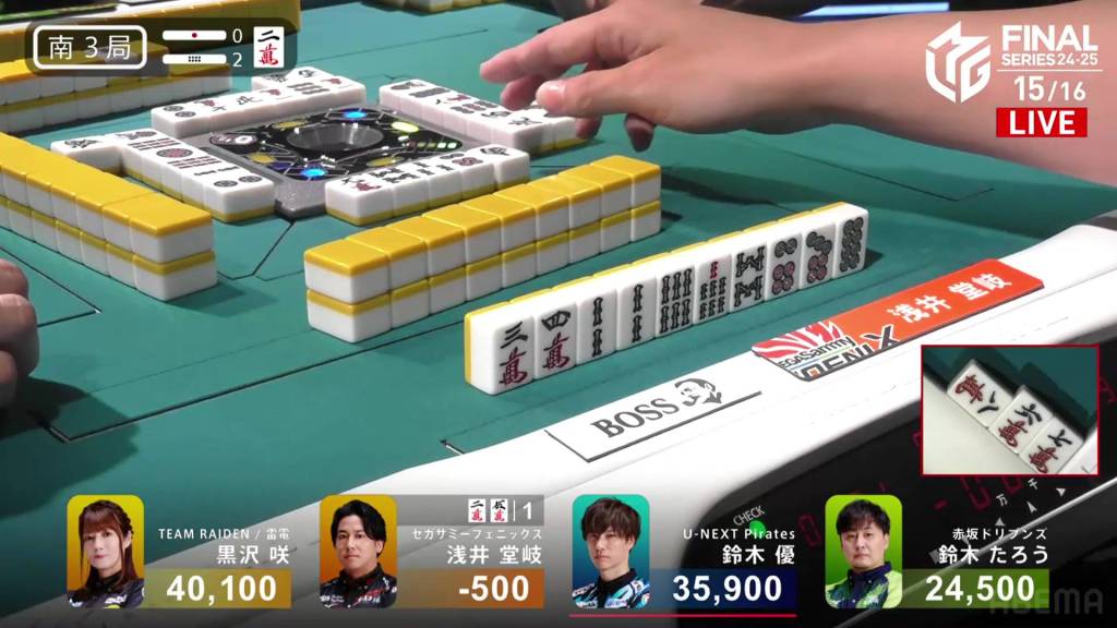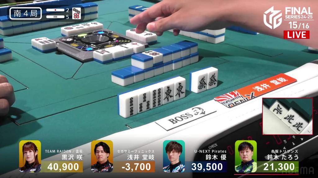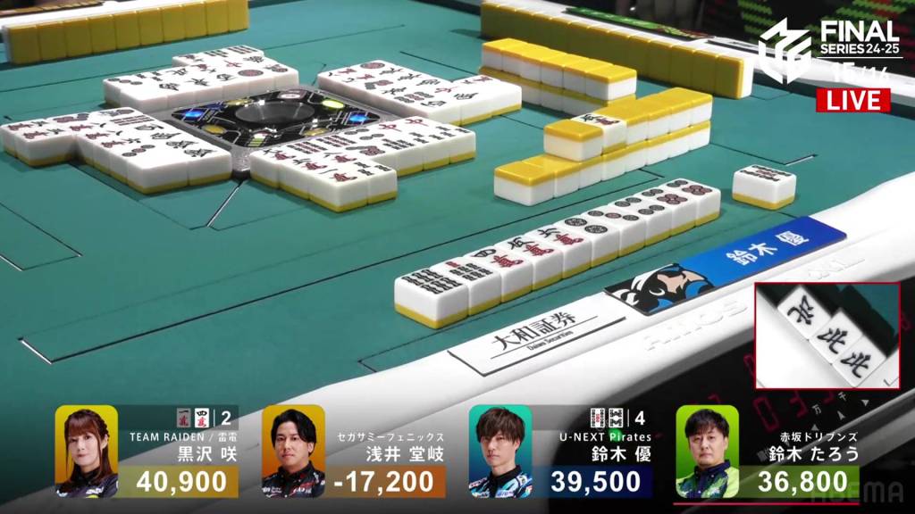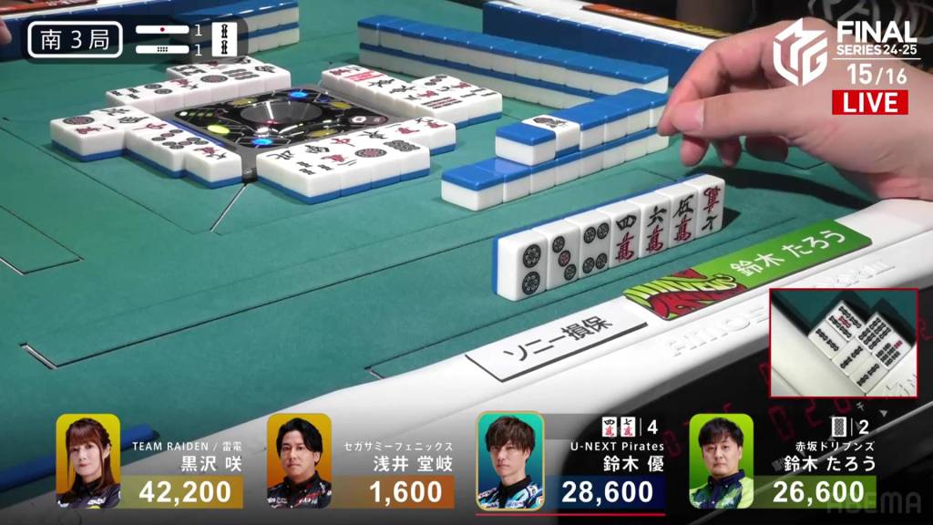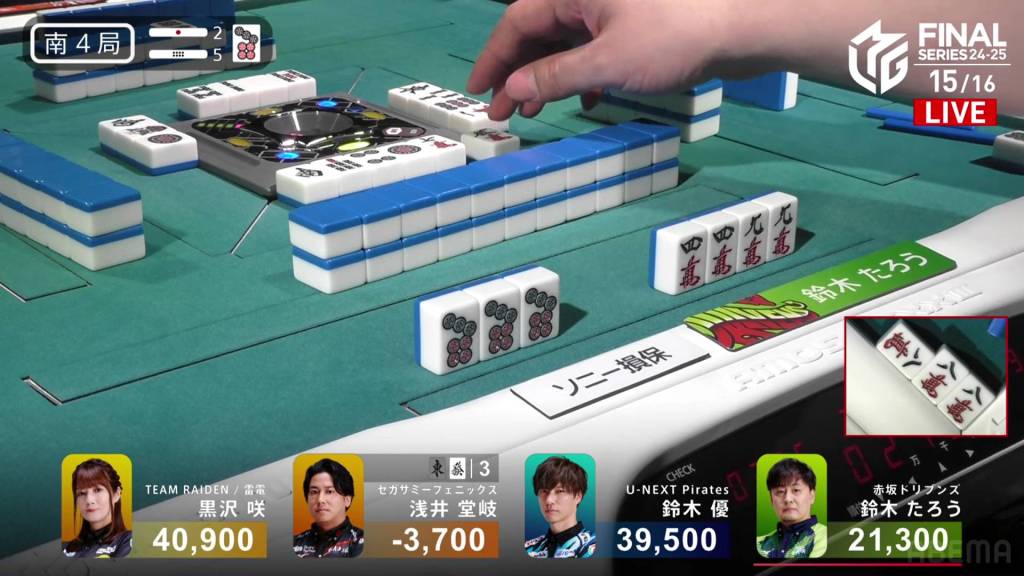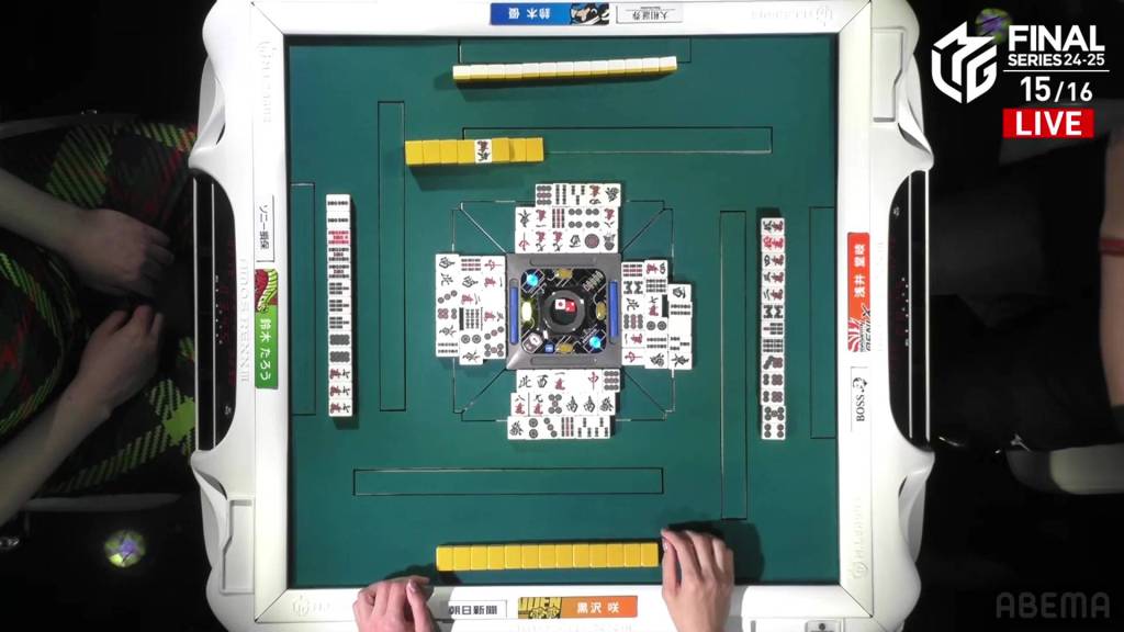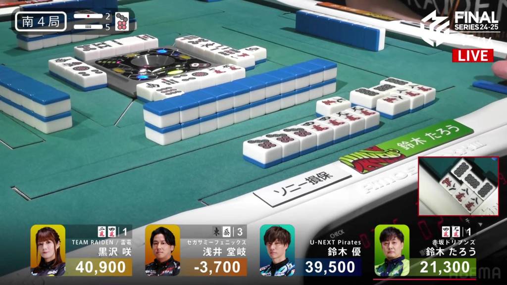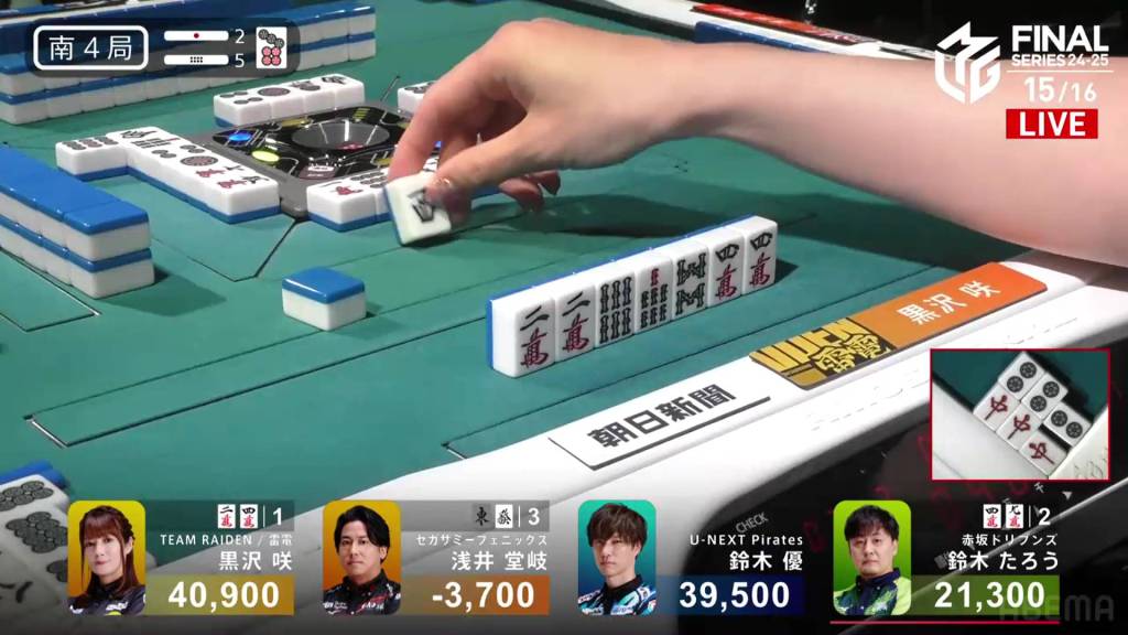 The call by Yu shifts the wall in Kurosawa’s favour giving her her winning 3m on her next draw. With her 5s pair being the uradora, Kurosawa wins with Riichi/Tsumo/Tanyao/Dora 1/Aka 1/Ura 2 for 3,000+100/6,000+100 plus two riichi sticks.