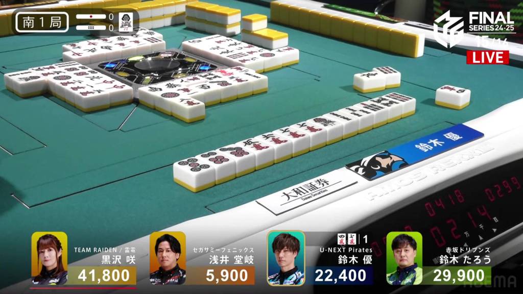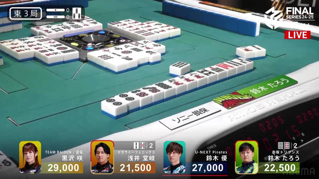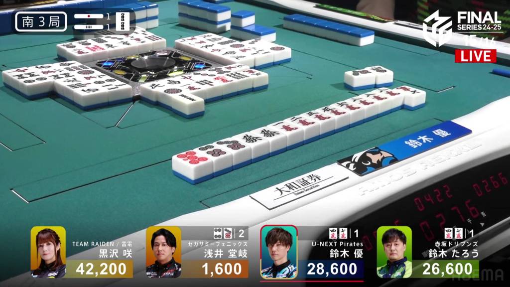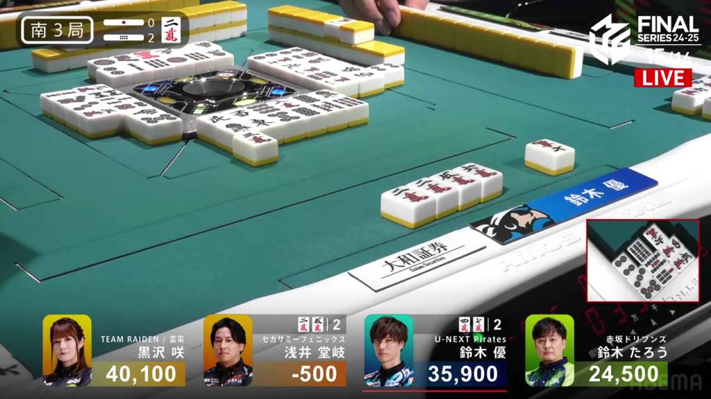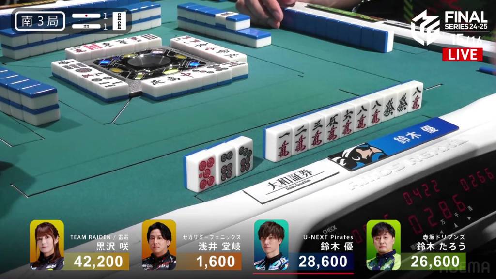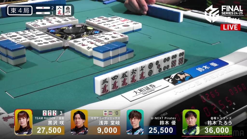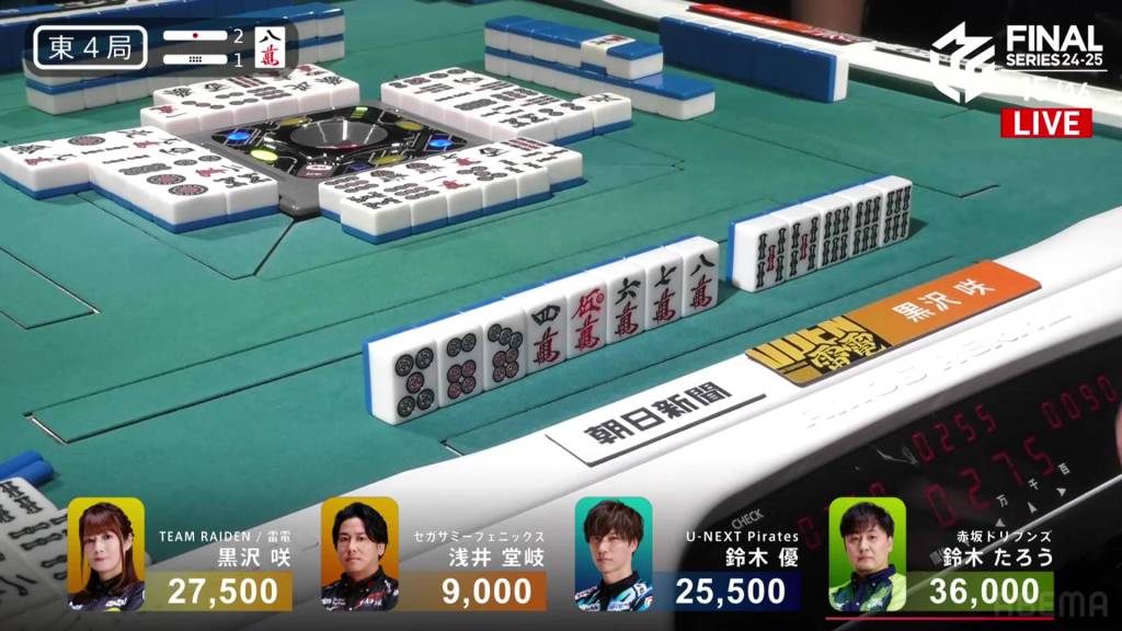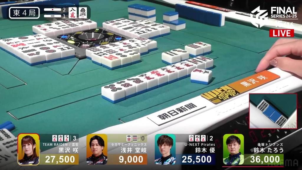 In E4-1, Kurosawa is in 2nd place and 8,500 behind 1st place dealer Taro. Two riichi sticks and a honba are in the pot.
