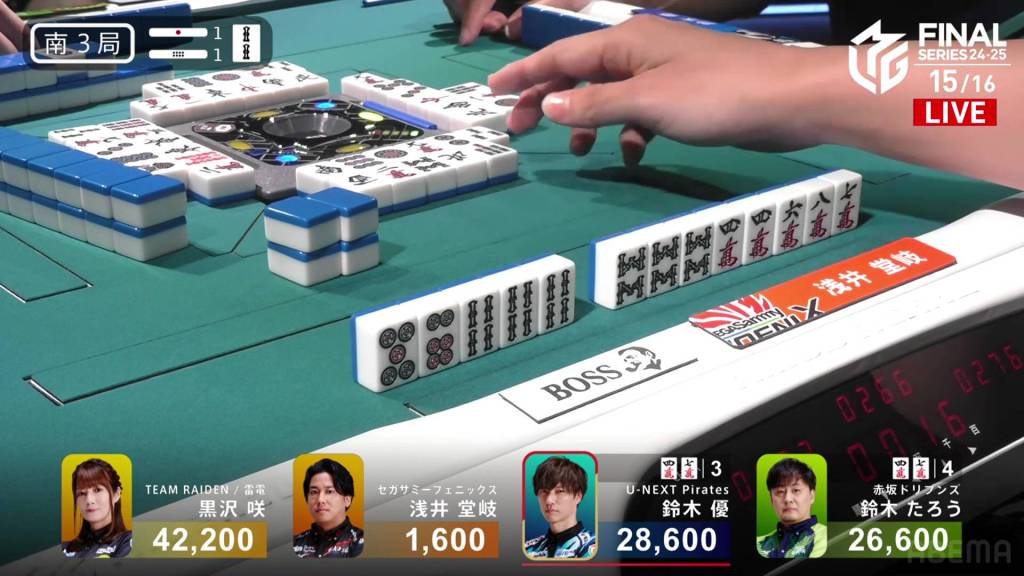 Jumping to S3-1, Yu is the dealer in 2nd place and 13,600 behind 1st place Kurosawa. A riichi stick and a honba are in the pot.