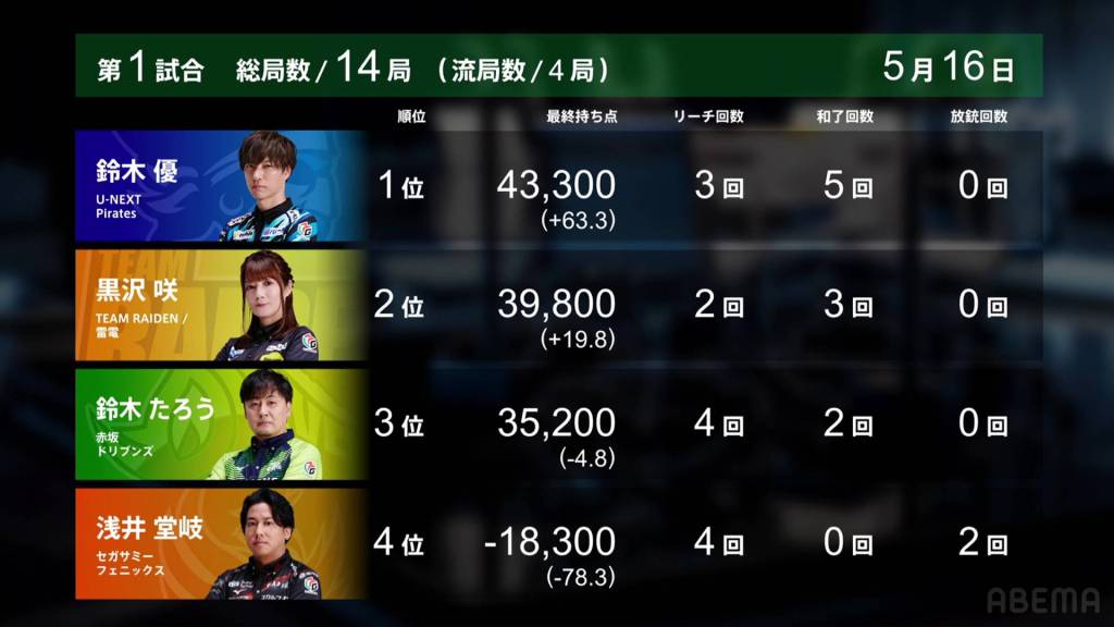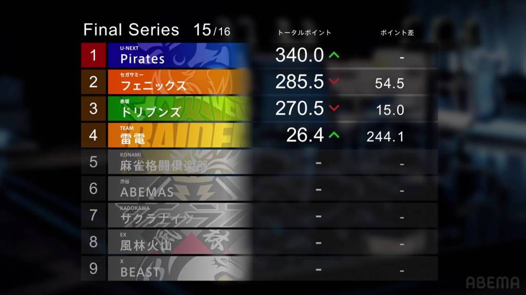 With another big win by U-Next Pirates and the Sega Sammy Phoenix getting a big 4th place, the U-Next Pirates move into 1st place for the first time in these finals. The champion is far from decided, with the Phoenix 54.5pts away from 1st place and the Drivens 69.5pts away from top spot.