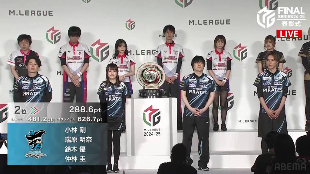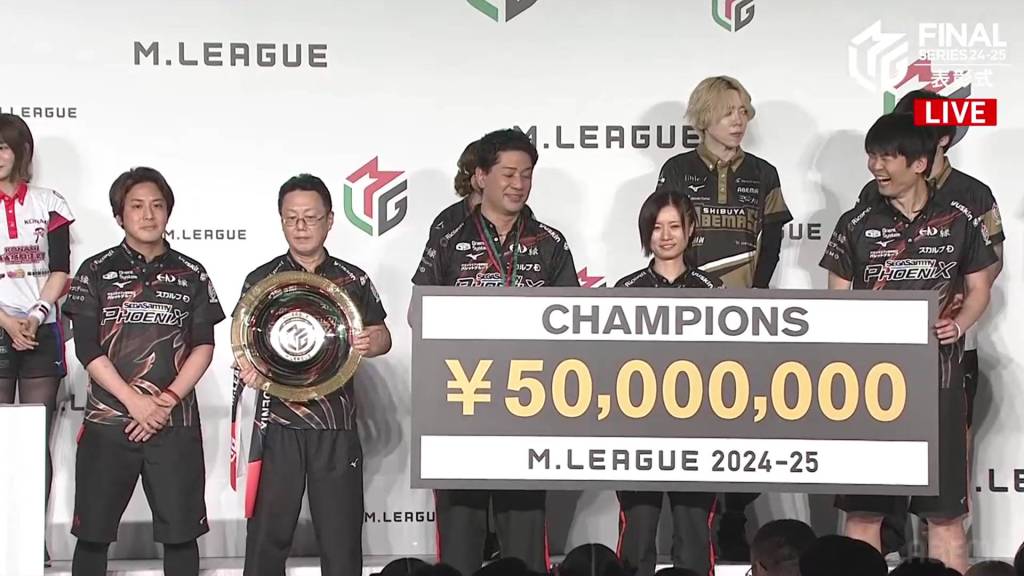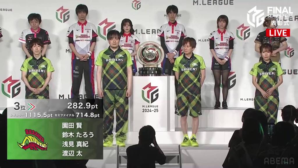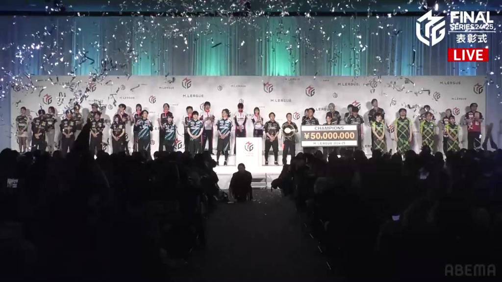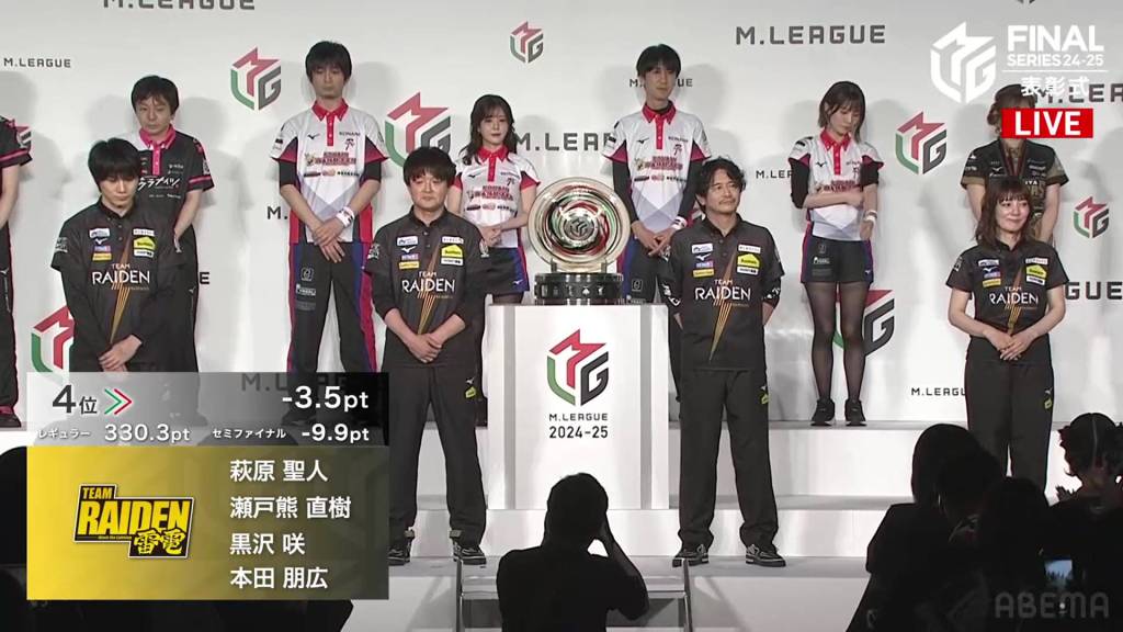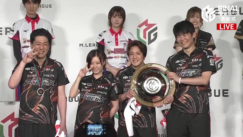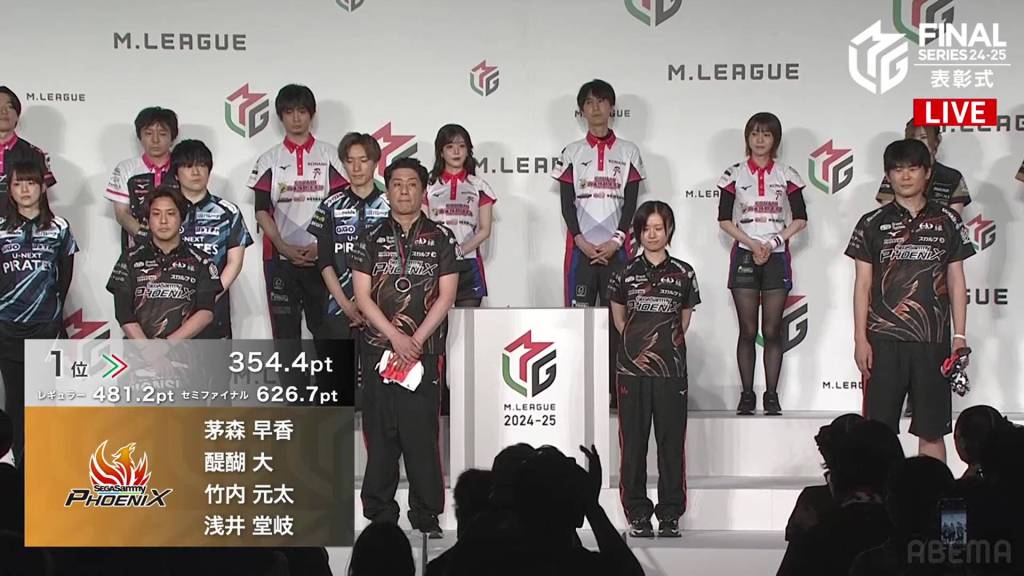 And finally, in 1st place and the M-League 2024-25 Champions we have the Sega Sammy Phoenix. As they walked down the aidle, they held their champioinship towel in the air. They finished with a score of +339.8pts in the regular season, +512.9pts in the semifinals and +354.4pts in the finals.