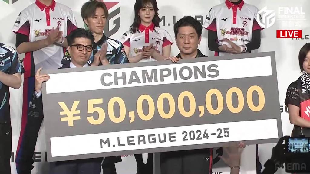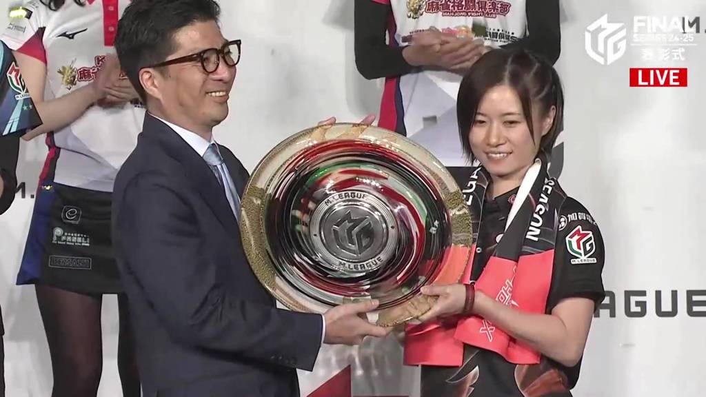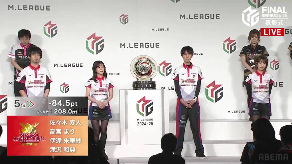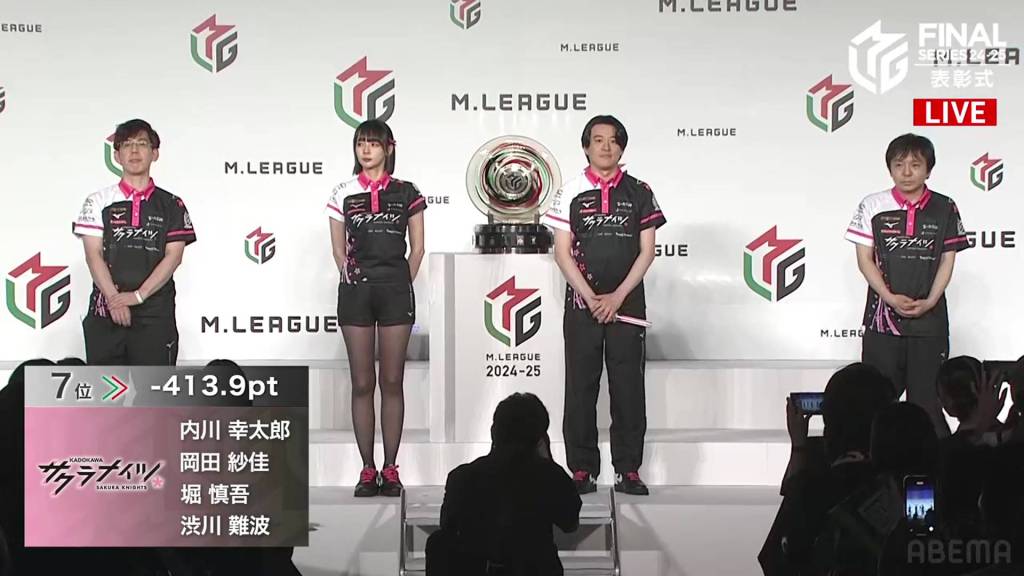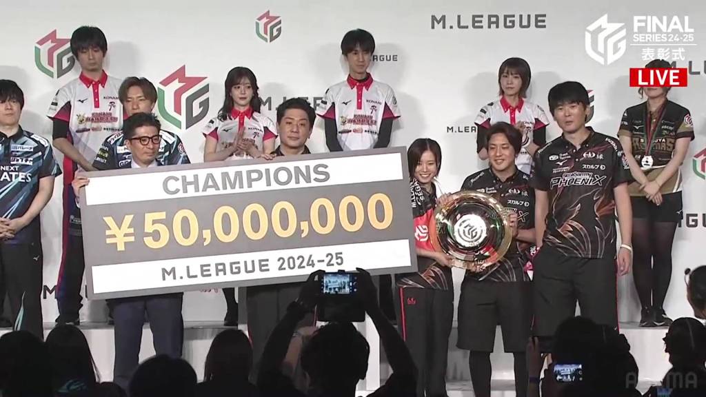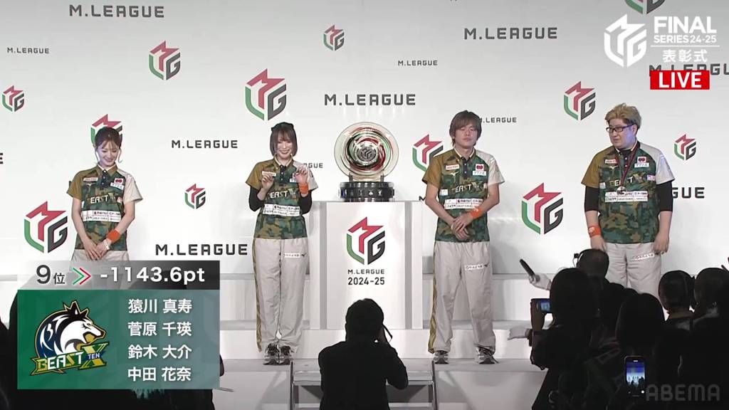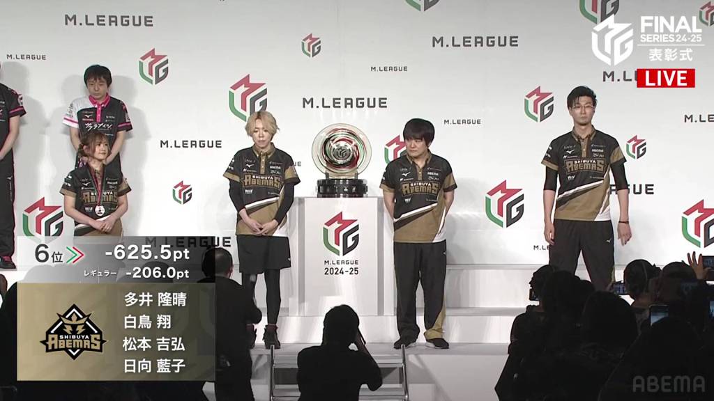 And finally, in 1st place and the M-League 2024-25 Champions we have the Sega Sammy Phoenix. As they walked down the aidle, they held their champioinship towel in the air. They finished with a score of +339.8pts in the regular season, +512.9pts in the semifinals and +354.4pts in the finals.