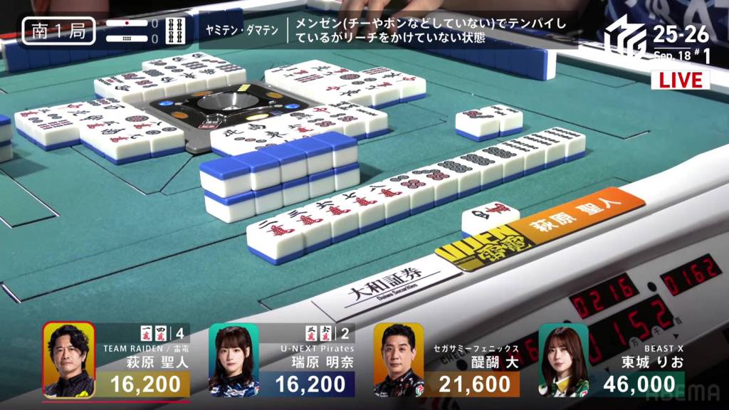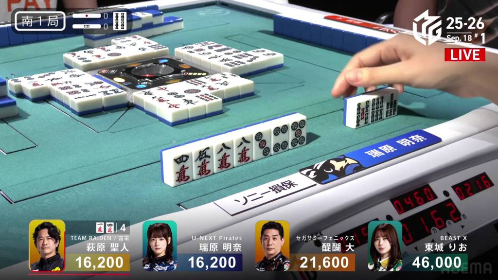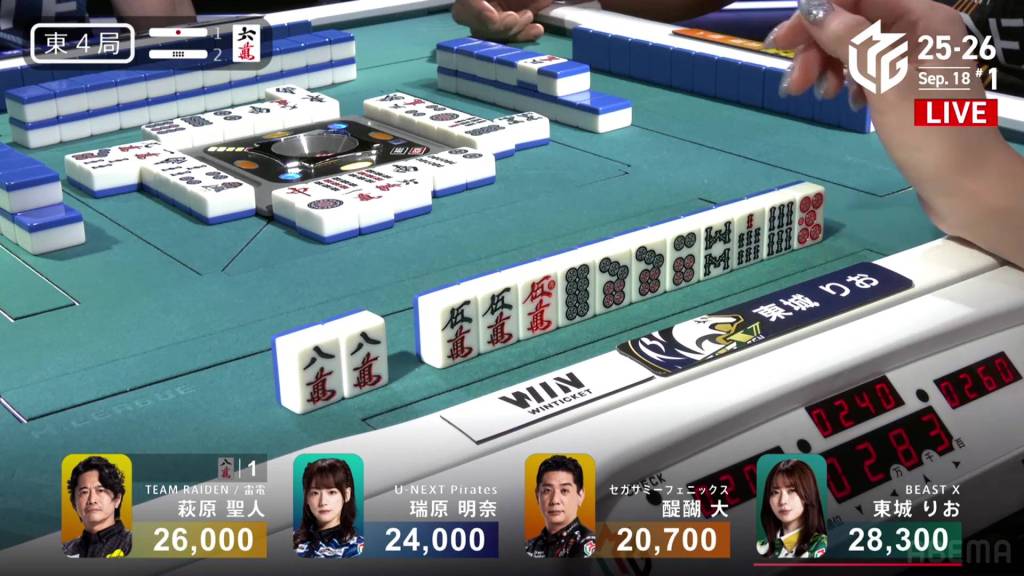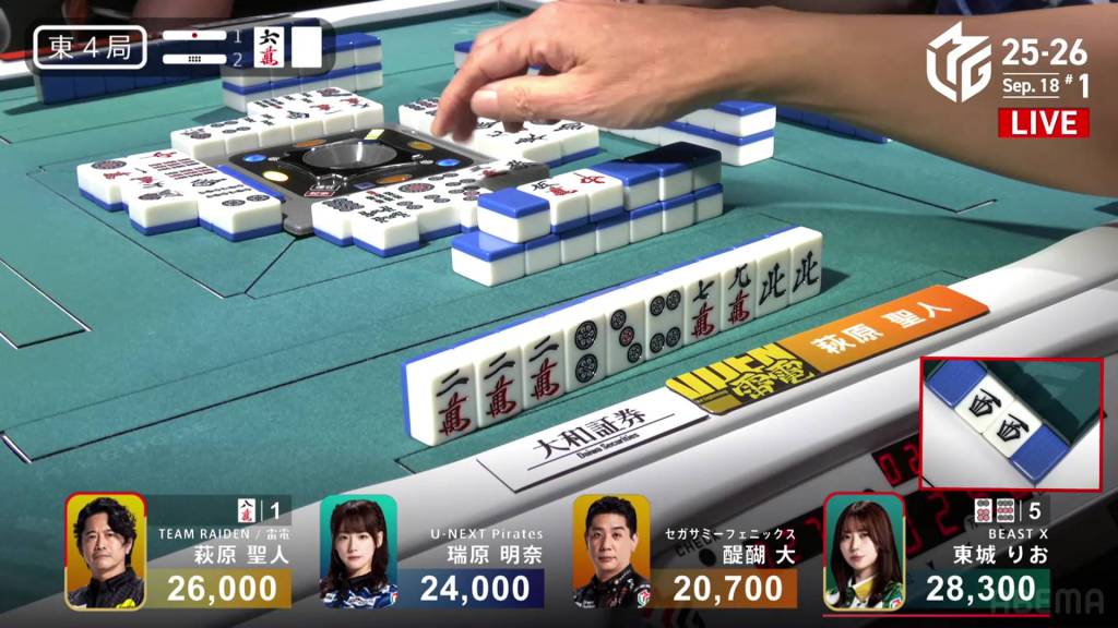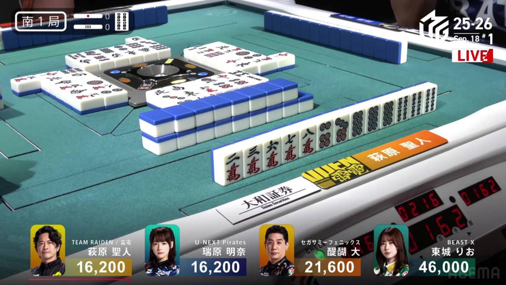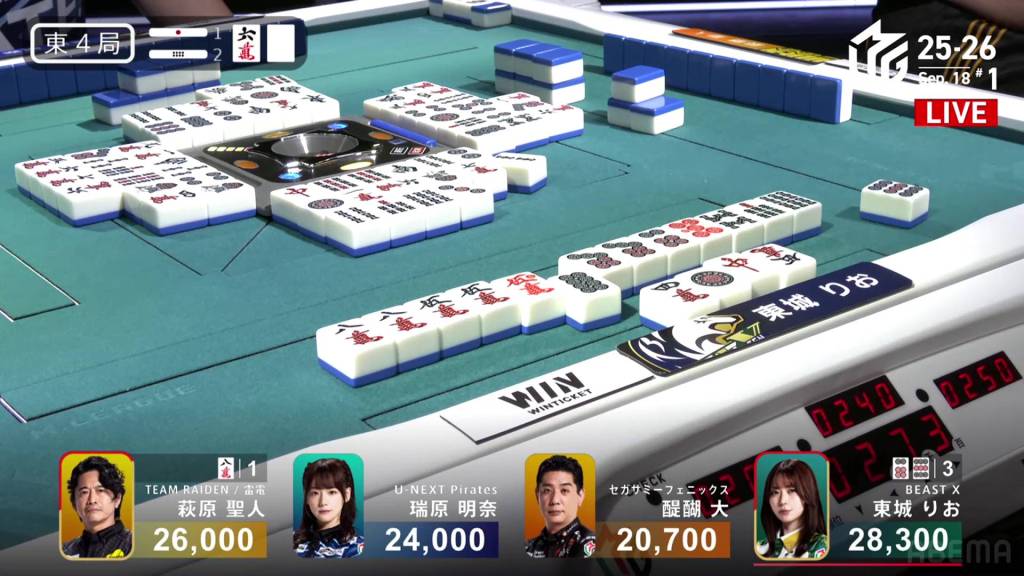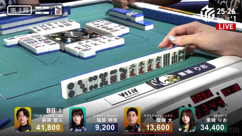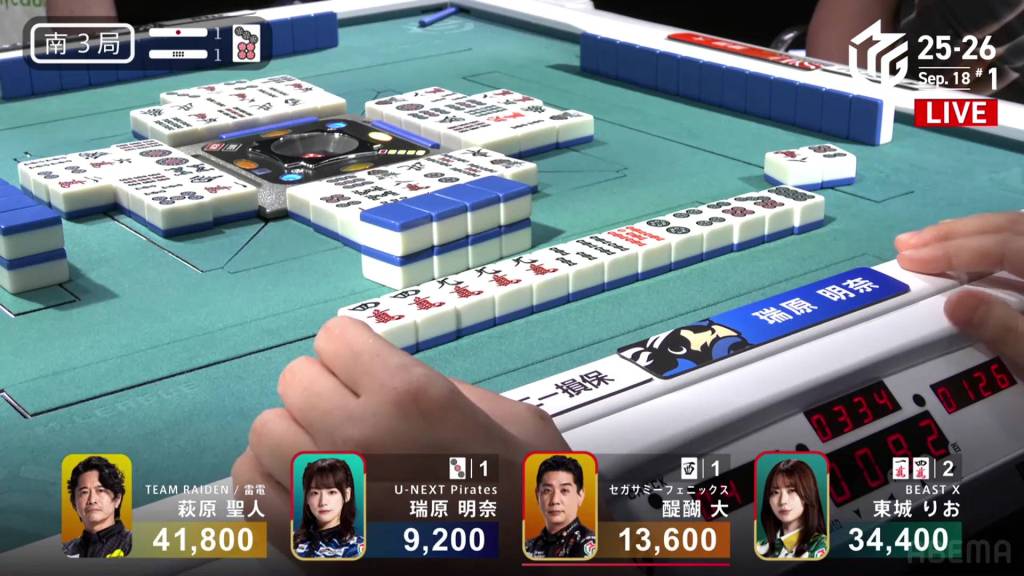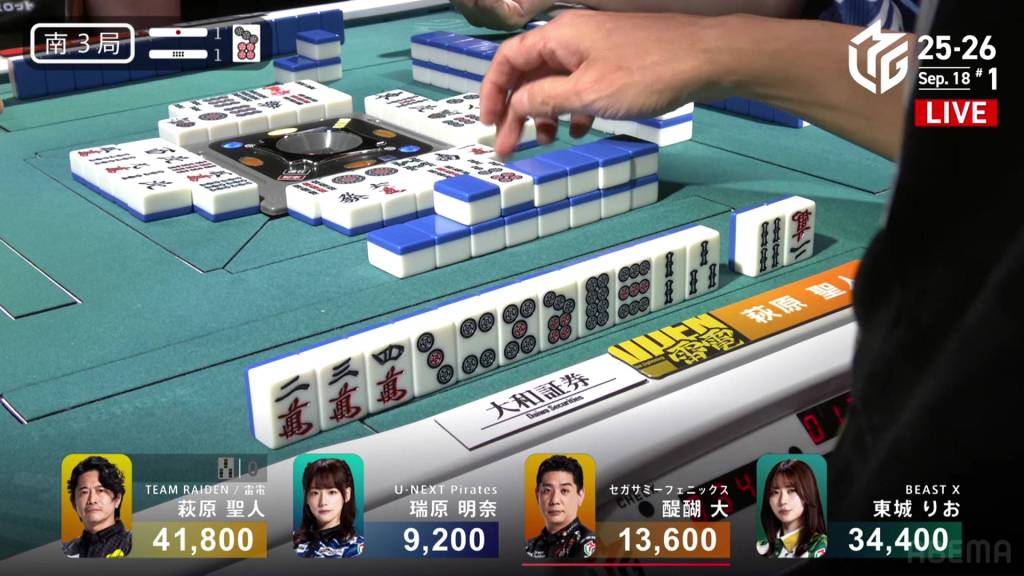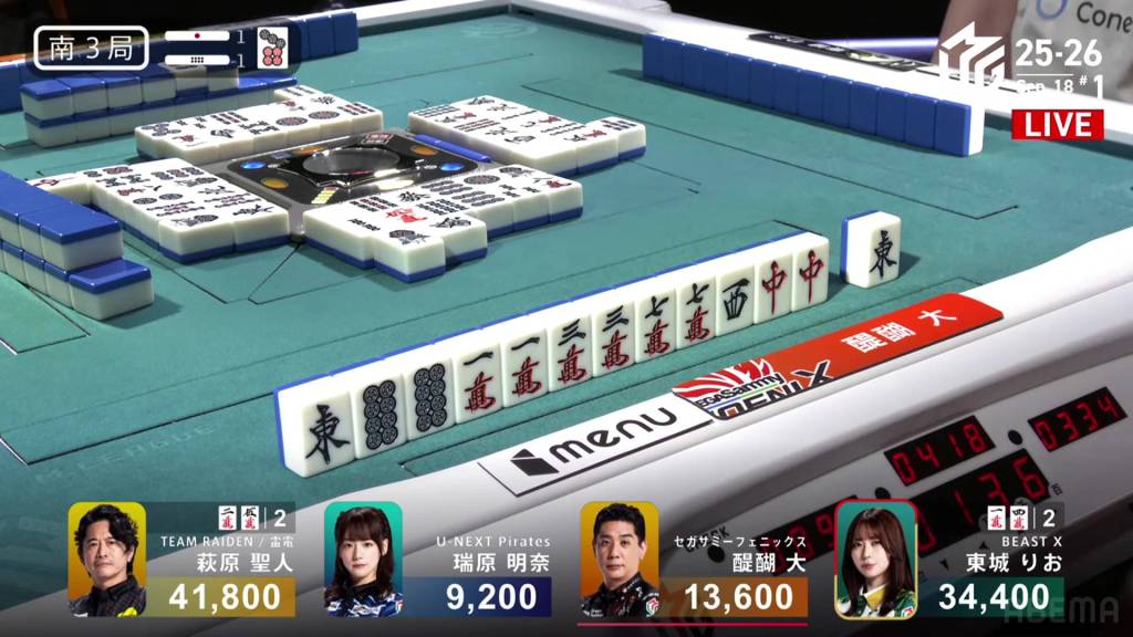 In S3-1, Mizuhara is in 4th place, 4,400 behind 3rd place dealer Daigo and 25,200 behind 2nd place Tojo. A riichi stick and a honba will provide the next winner 1,300 in extra value.