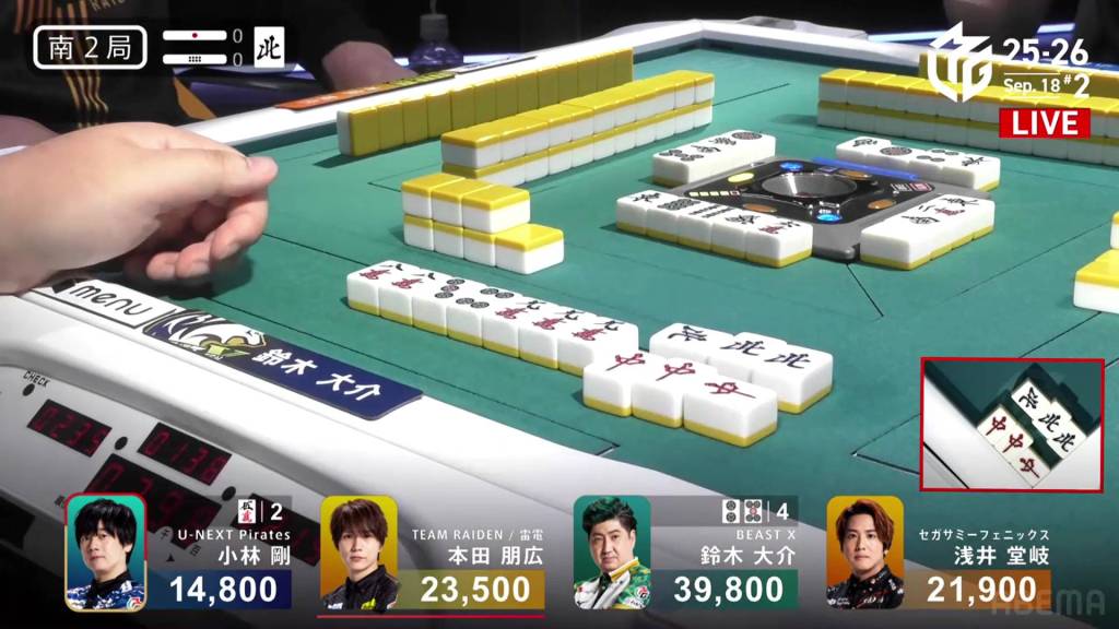 Interestingly, Honda risks throwing the dora north during the ippatsu round to take iishanten. This allows Daisuke to call pon and get to tenpai on a 25p ryanmen. Soon after, Honda discards a 5p and deals into Daisuke. Daisuke wins the hand with Red Dragon/Dora 3 for 8,000 plus Kobayashi’s riichi stick.