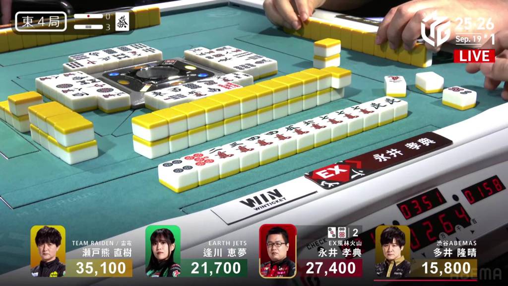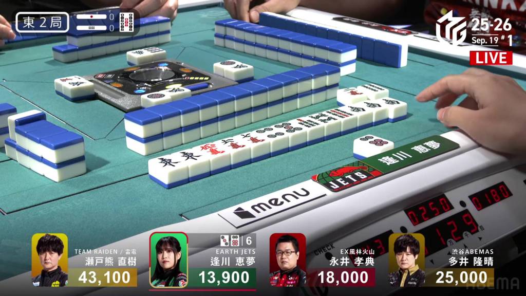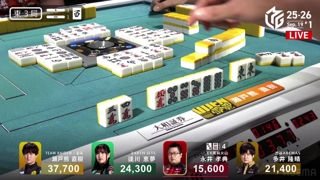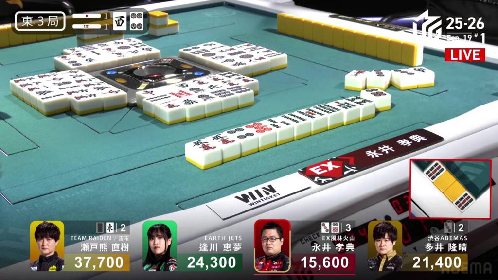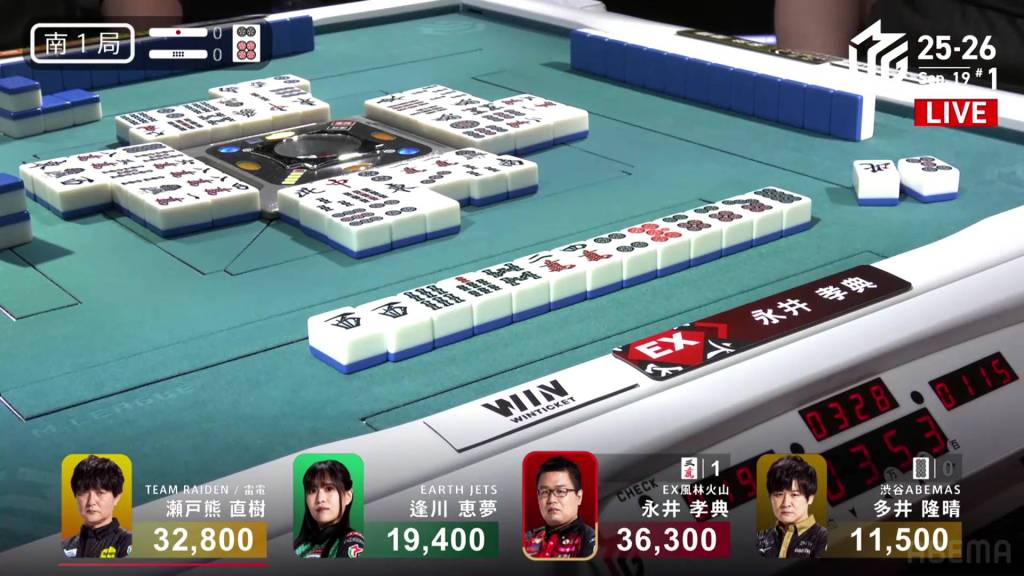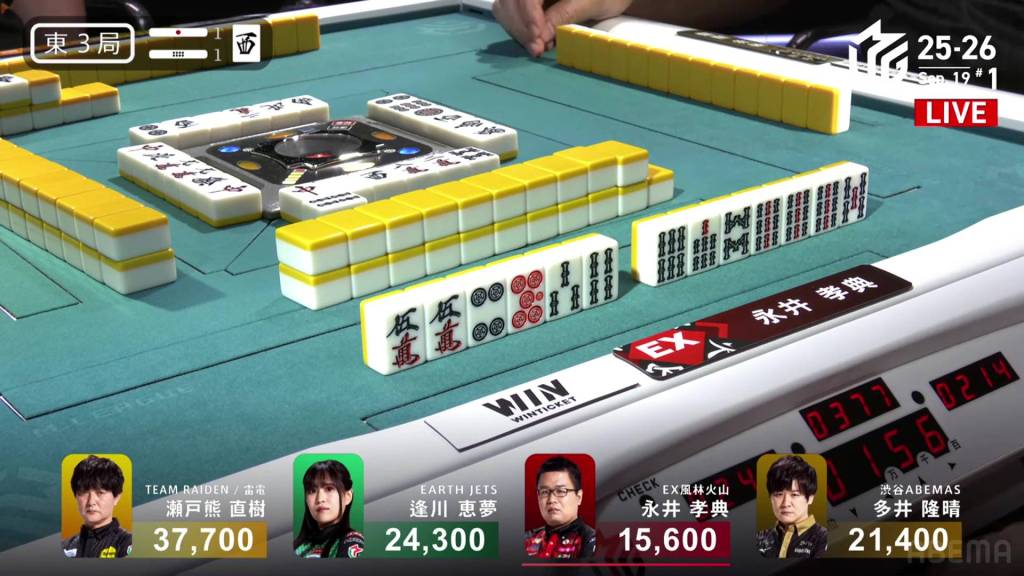 In E3-1, Nagai Kousuke is playing in his very first game. he is down early and is 5,800 behind 3rd place Ooi. With his dealership and a riichi stick in the pot, he can make good progress with a good win.