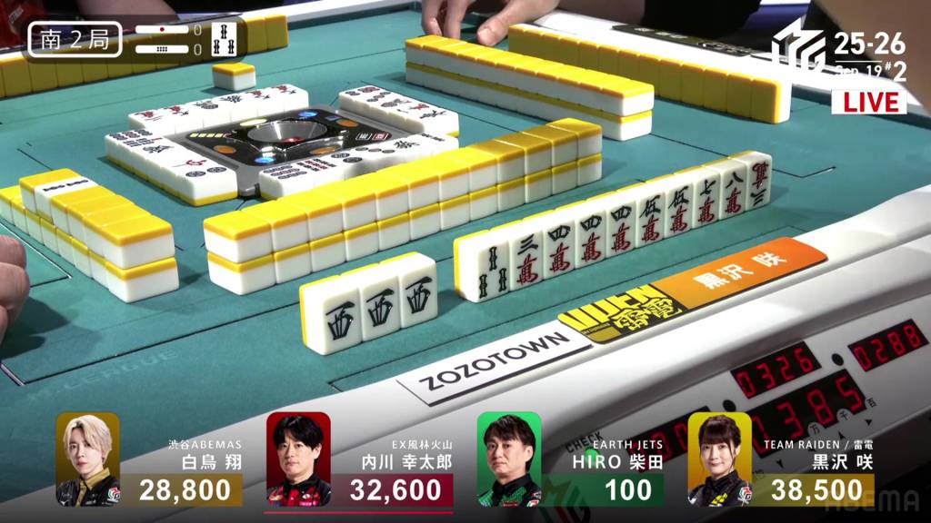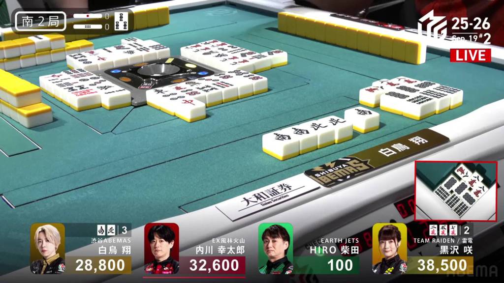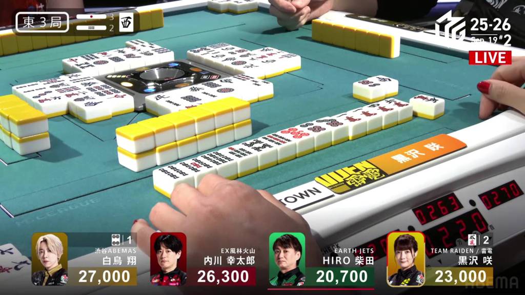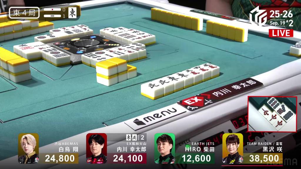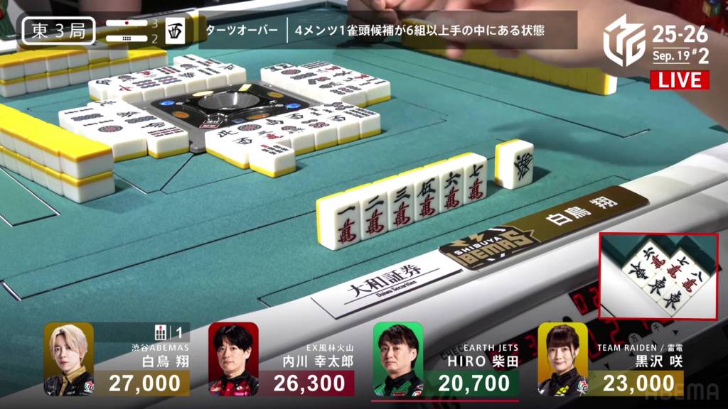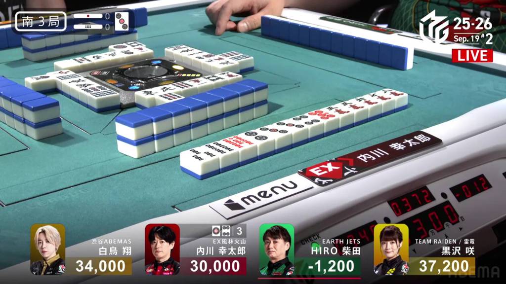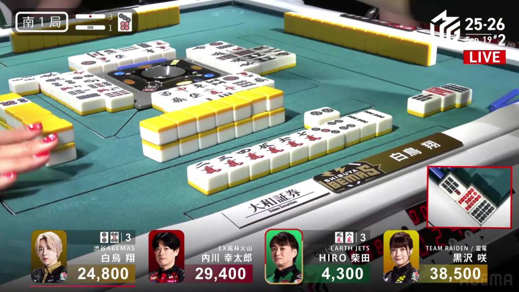 In S1-1, there are three riichi sticks in the pot after the previous hand’s riichi battle went to a draw. Shiratori is the dealer in 3rd place, 4,600 behind 2nd place Uchikawa and 13,700 behind 1st place Kurosawa.