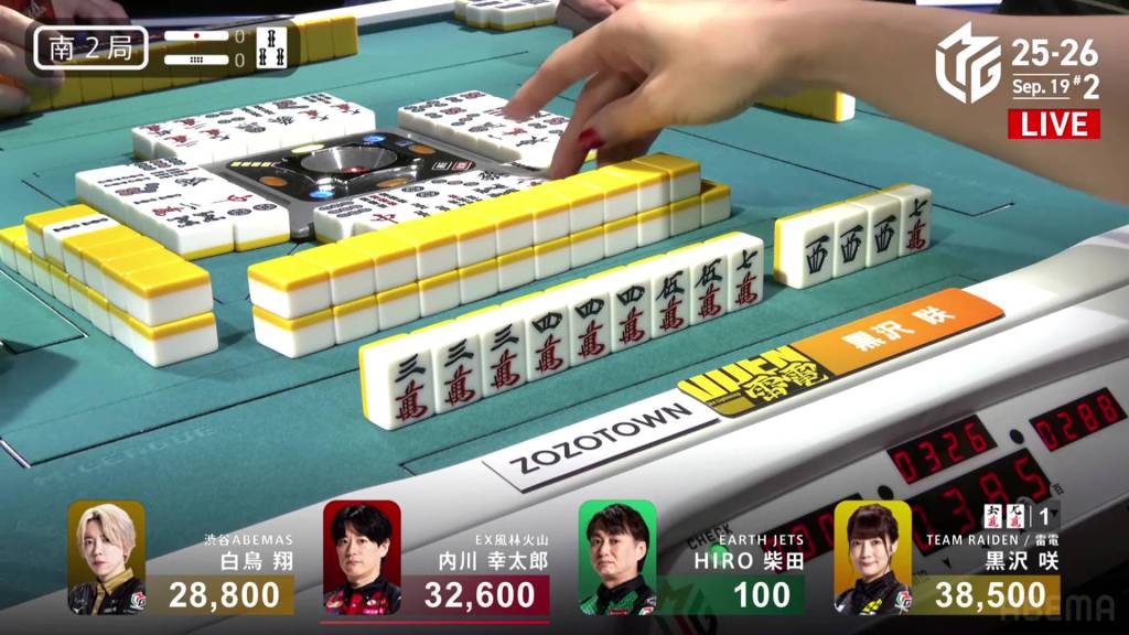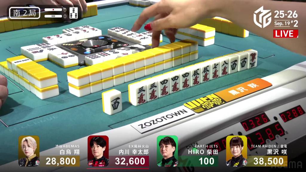 In E3-2, Kurosawa is in 3rd place and just 4,00 behind 1st place Shiratori. With three riichi sticks and two honba in the pot, any win will put her on top.