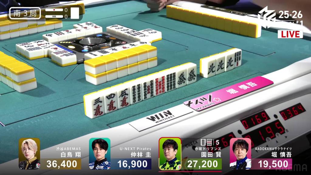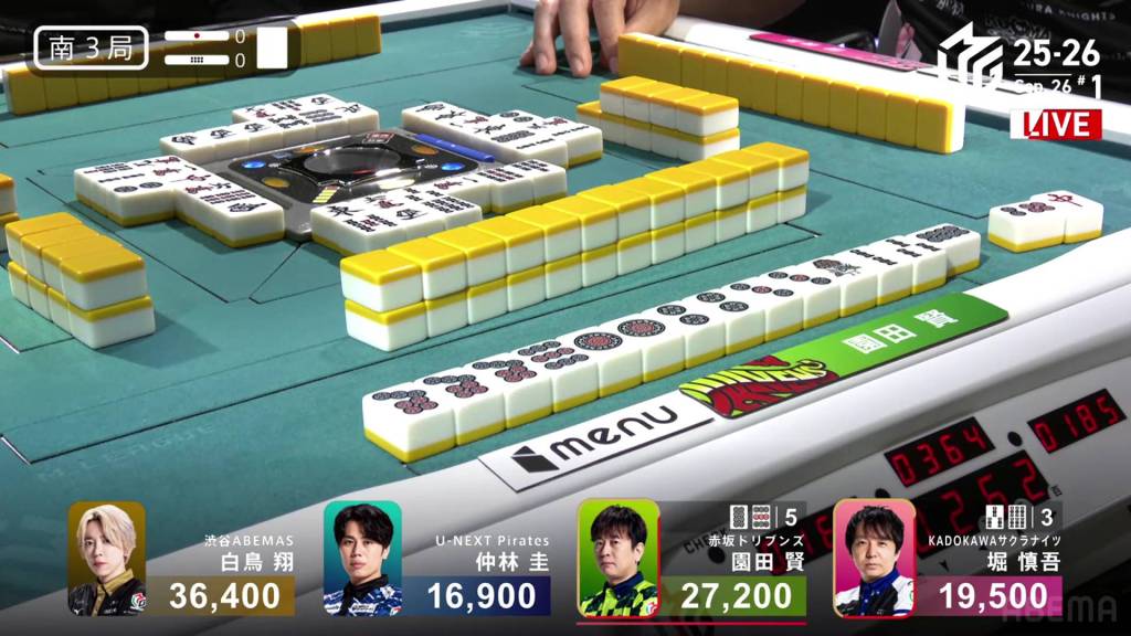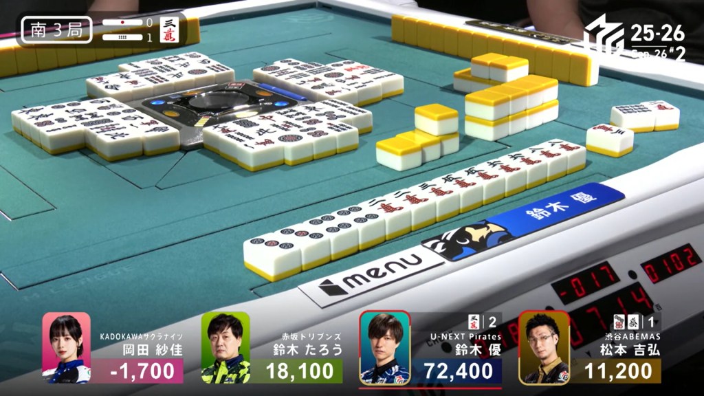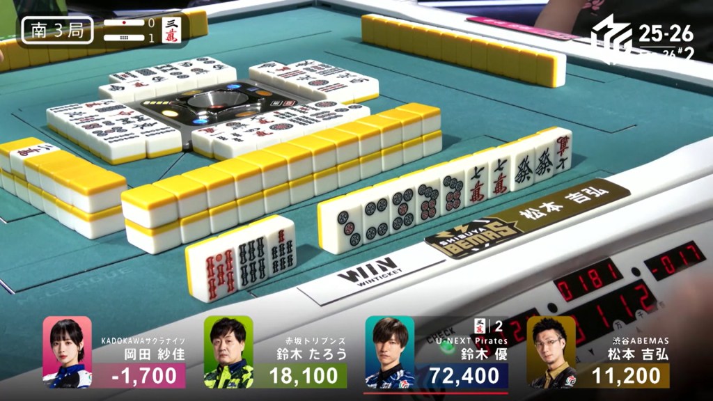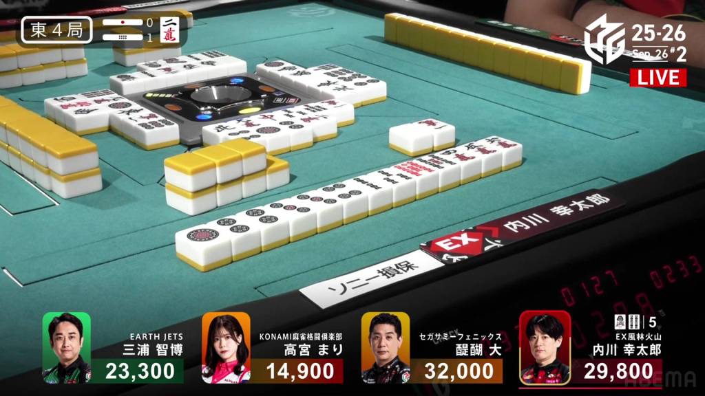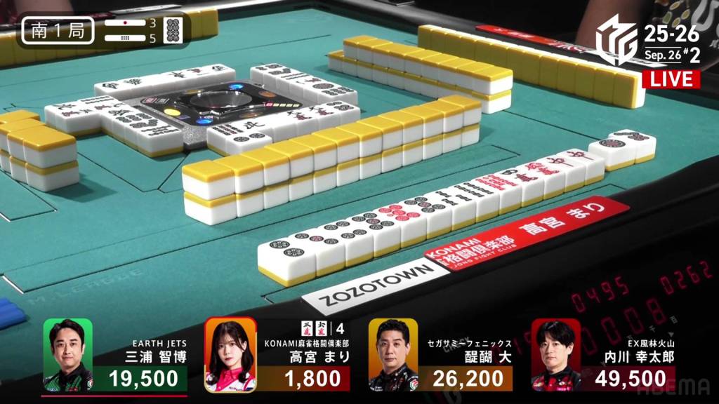 In S1-5, the pot is stacked after the past two hands went to a draw. With three riichi sticks and five honba, the next winner will get an extra 4,500 in bonuses. Sitting in 4th place is Takamiya, 17,700 behind 3rd place Miura.