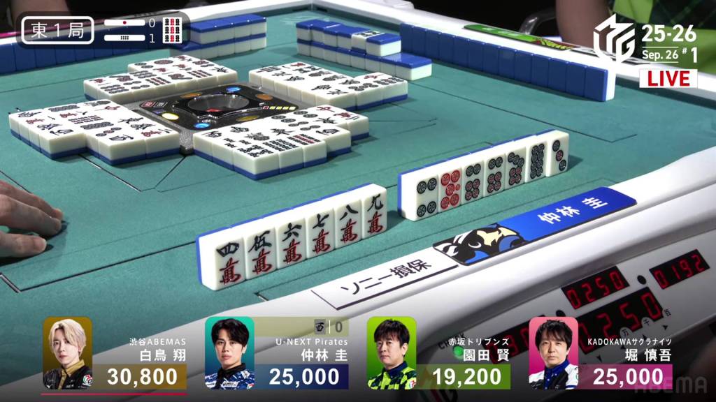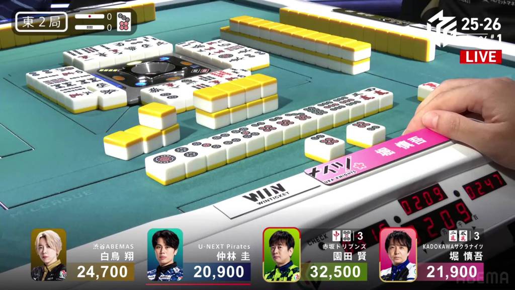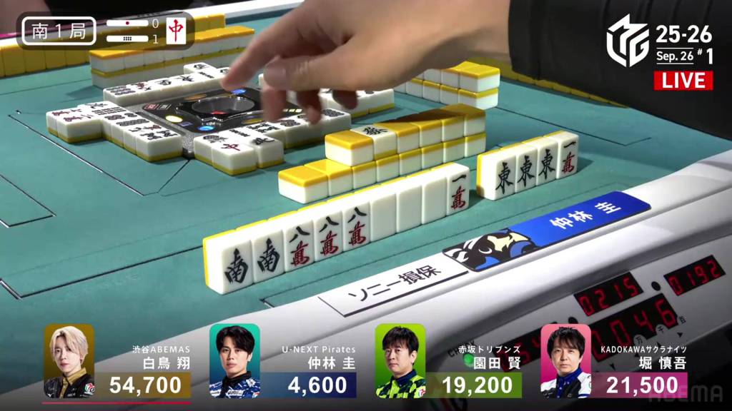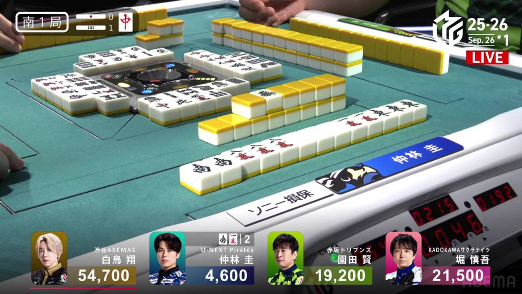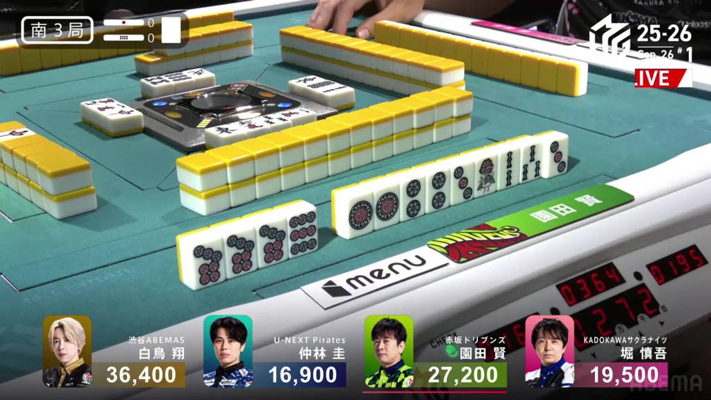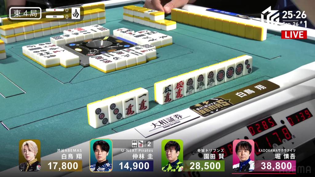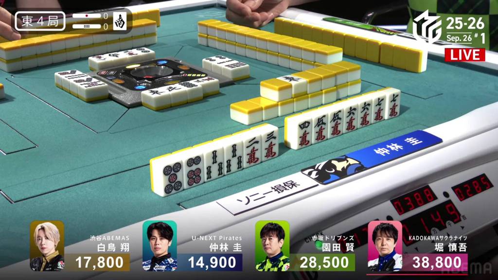 In S1-5, the pot is stacked after the past two hands went to a draw. With three riichi sticks and five honba, the next winner will get an extra 4,500 in bonuses. Sitting in 4th place is Takamiya, 17,700 behind 3rd place Miura.