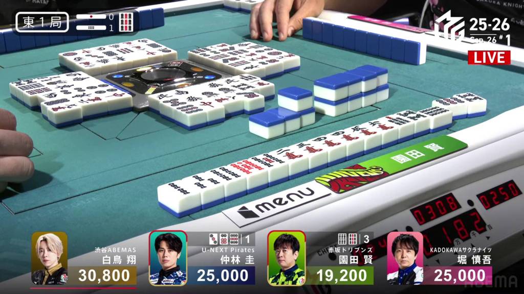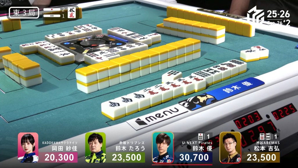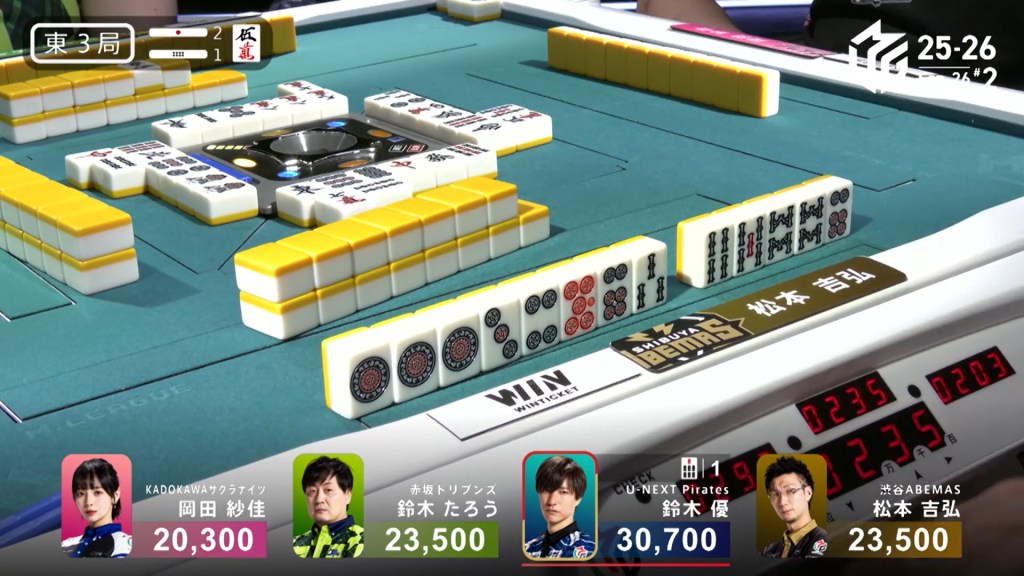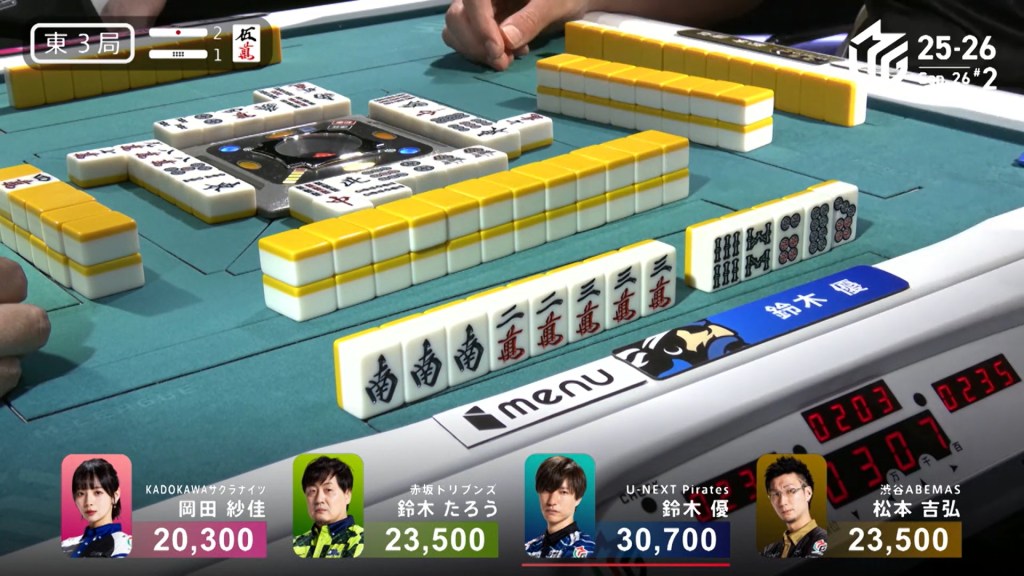 In E3-1, Yu is the dealer in 1st place, but being at 30,700 is far from secure. Two riichi sticks and a honba sit in the pot.