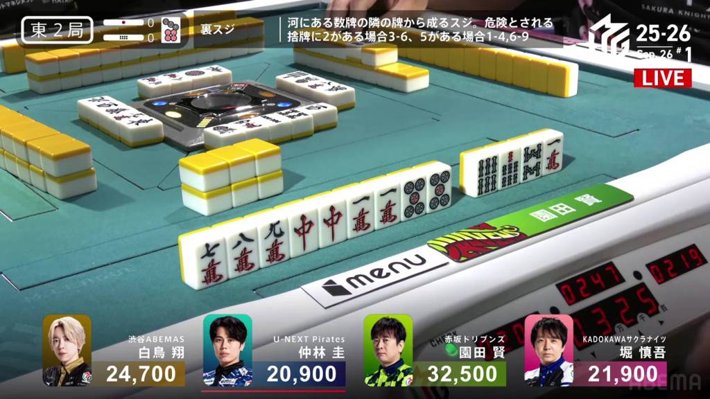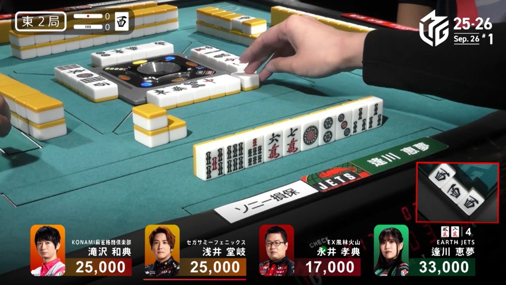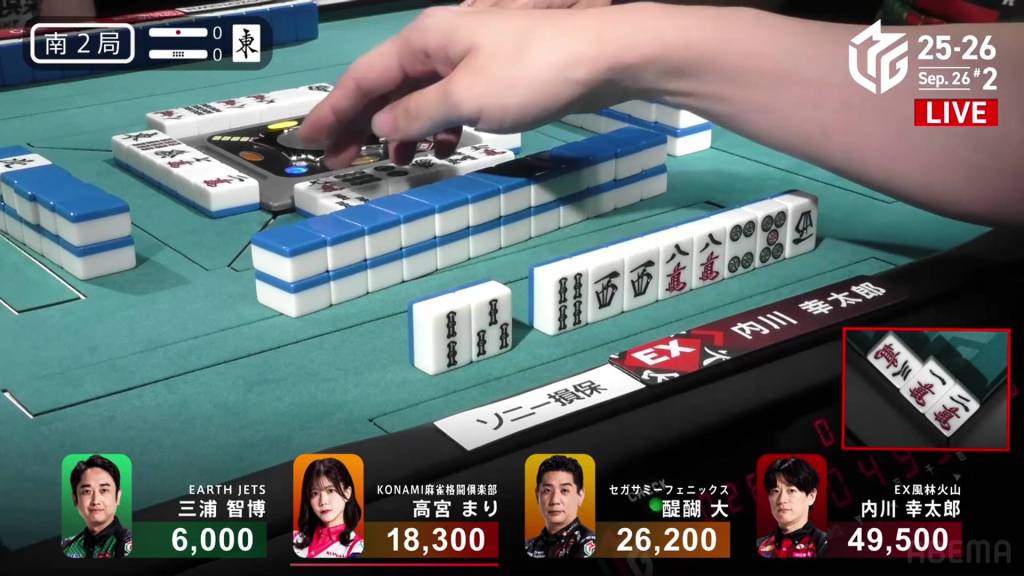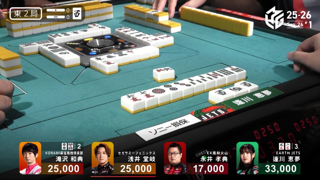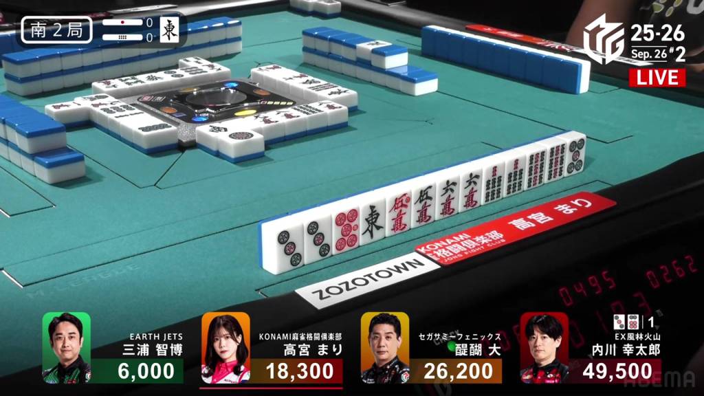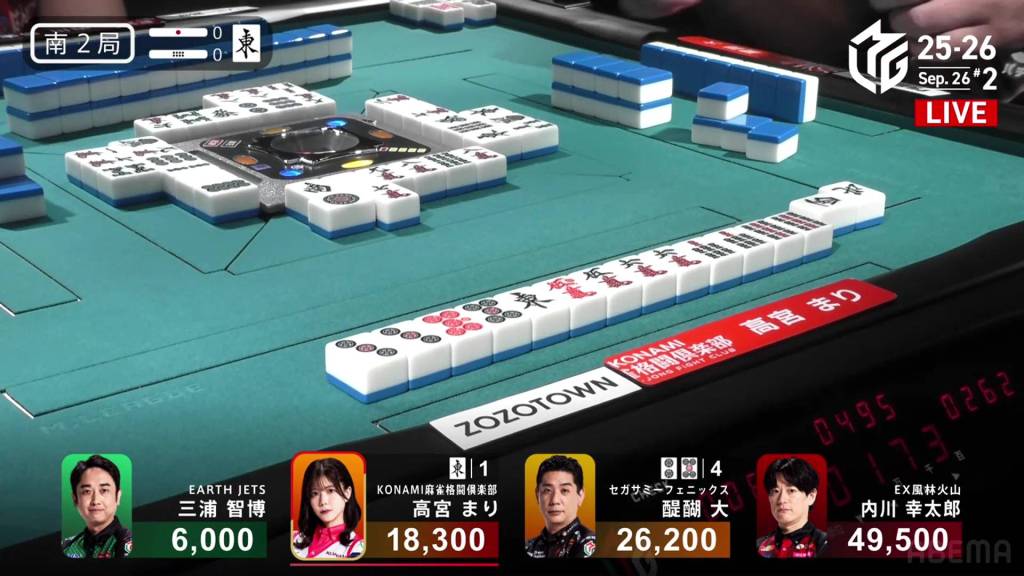 In E2-0, Aikawa is in 1st place after winning a strong White Dragon/Dora 3/Aka 1 hand to start the game.