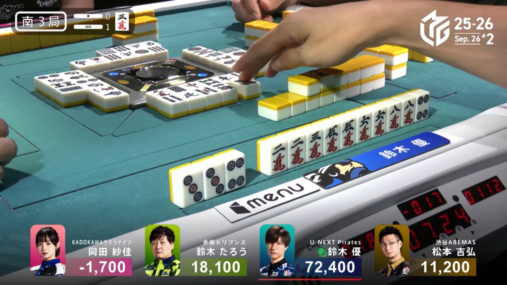 The hand is special in two ways. If he draws either of the waits by tsumo, he will win with a suuankou yakuman. However, if he wins on the 1m, he will also have the league’s very first sanshoku doukou, a yaku that has not been seen in the league’s 7 year history.