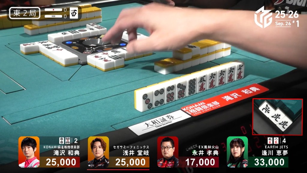 To her right Takizawa is iishanten with a guaranteed good wait. At the start of the second row, Takizawa calls pon on the norths and waits on a 25p ryanmen.