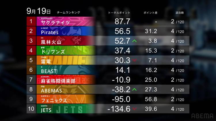 Losing points are the Akasaka Drivens, Beast X, Konami Mahjong Fight Club, Kadokawa Sakura Knights and Shibuya Abemas. An even week for the Akasaka Drivens sends them slghtly negative, but the team remains above 0.0pts and in 4th place. The Beast X are in a similar position with only 2nds and 3rds, but they also remain positive overall. The Konami Mahjong Fight Club had six games this week, but were unable to get 1st in any of them, falling down to 8th. The Sakura Knights had an okay result on Thursday with a 1st and 3rd that kept them near the top, but back-to-back 4ths by Hori and Okada pushed the team all the way down to 5th place. And for the Shibuya Abemas, Shiratori’s yakuman wasn’t enough for him to maintain 1st place, and the 3rd and two 4ths just brought the team down more and put them in 9th.