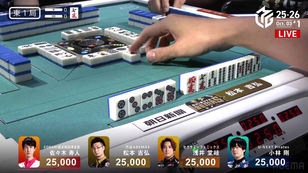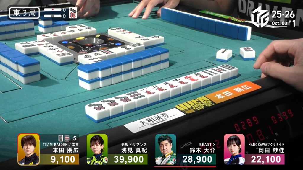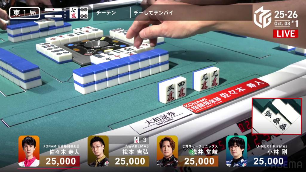 To her left, Akutsu is also going for tanyao. With a chii on the red 5p, he is the first to tenpai and waits on a 258s wait. However, he is furiten from the 8s discarded at in his first row.