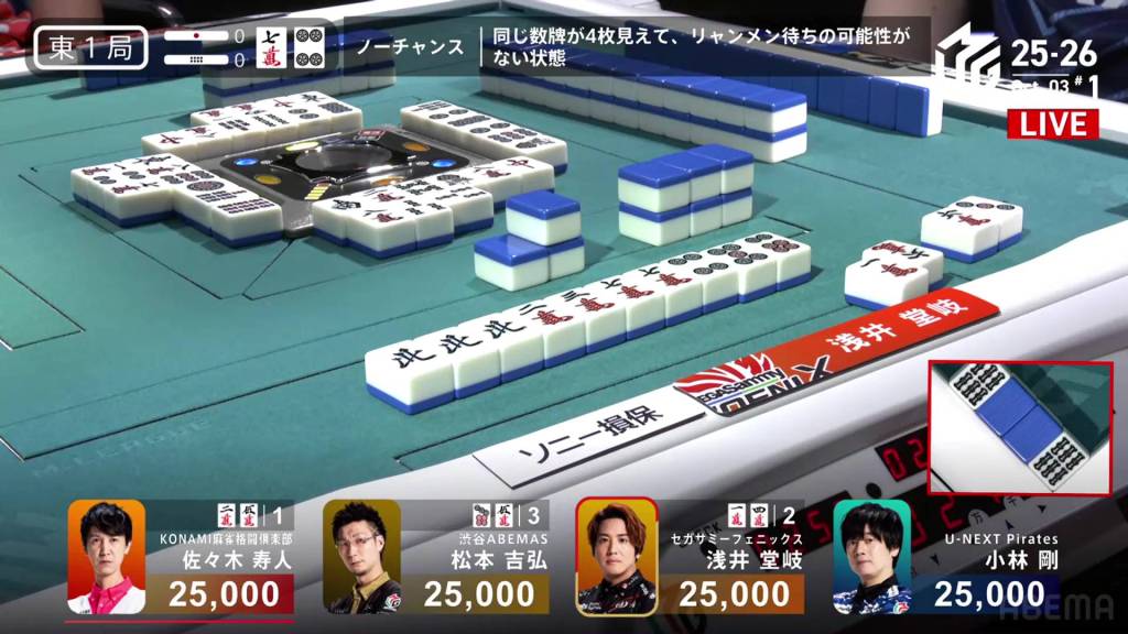 In E1-0, Sonoda is the starting dealer and starts out with an incredible starting hand. Sitting iishanten with sanshoku guaranteed with his first draw, Sonoda is lined up for a strong hand. On turn 4, Sonoda gets to tenpai and waits on a 7s penchan.