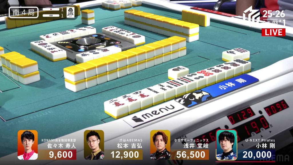 In S4-1, Kobayashi is the dealer in 2nd place, a whole 36,500 behind 1st place Takaki. Though 1st place is hard to get to , anything can happen with a dealership. The riichi stick and the honba in the pot will help a little.