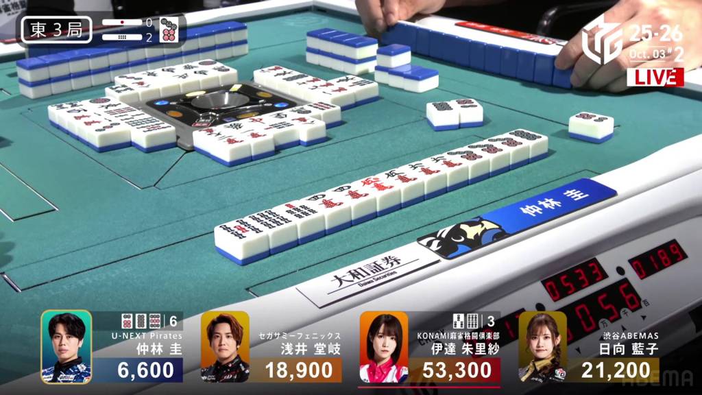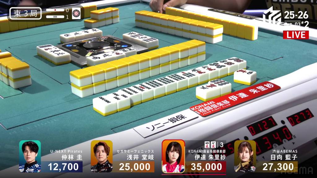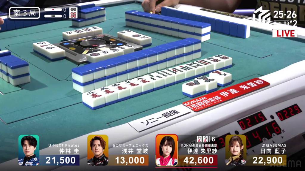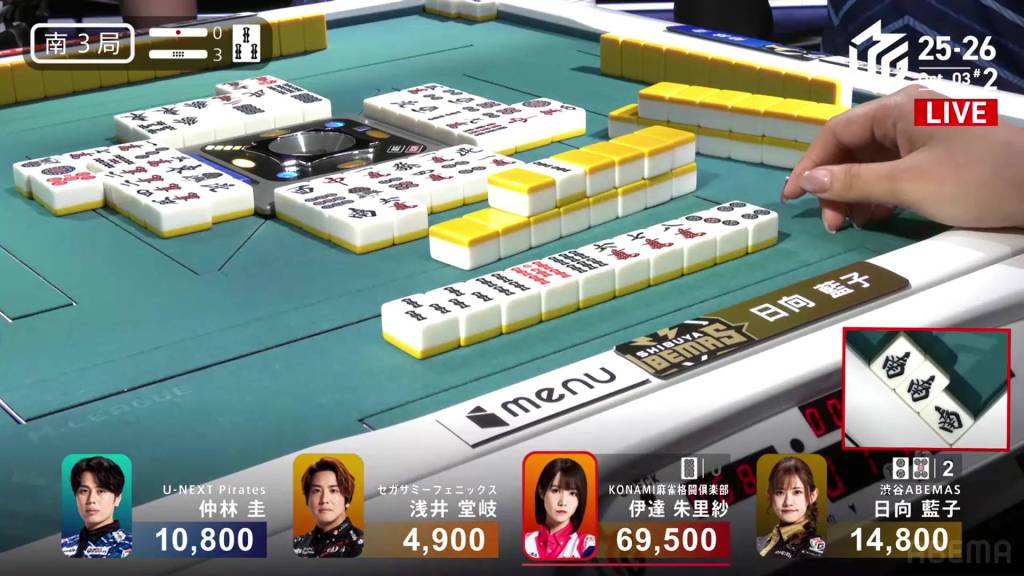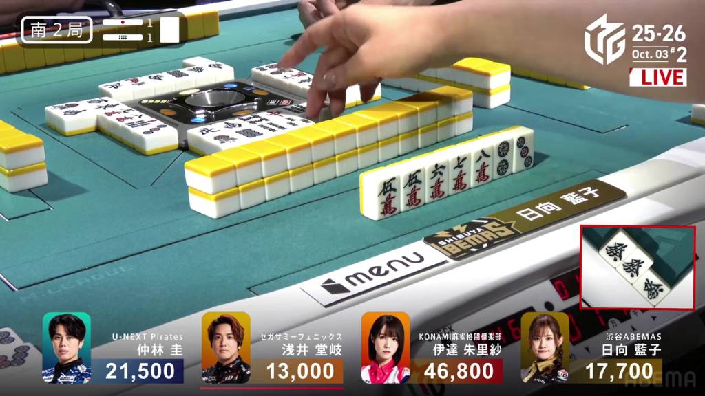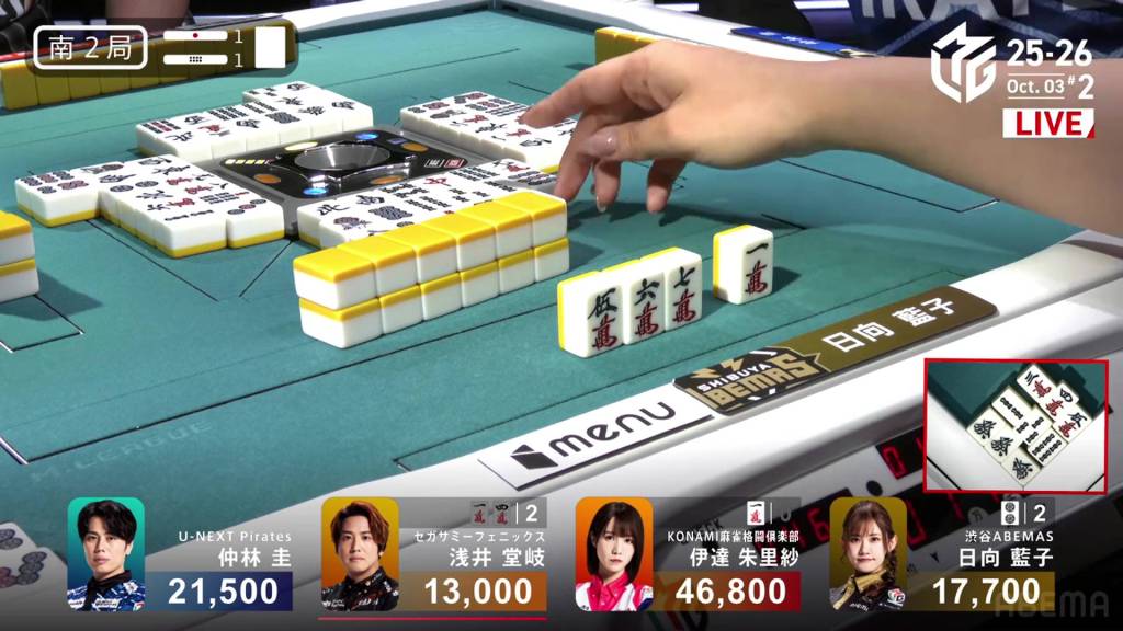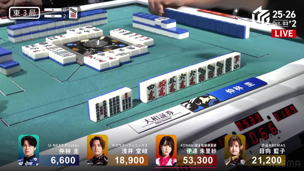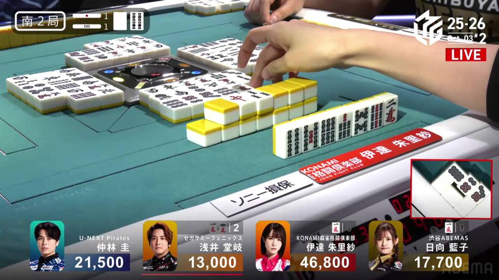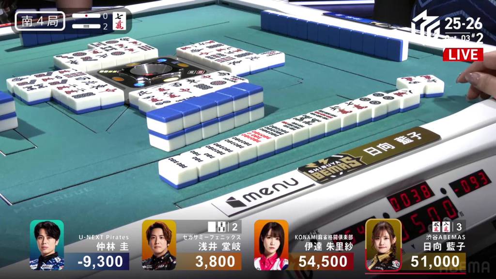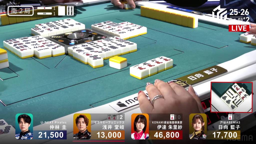 When it goes around to Nakabayashi, he spots a single white dragon already discarded during the first turn. Thinking it to be safer, Nakabayashi discards it and deals into Hinata. With a flip, Hinata gets the uradora and hits the shortcut. Hinata wins the hand with Riichi/Ippatsu/Chiitoi/Ura 2 for 18,000, one of the fastest hanemans in M-League history.