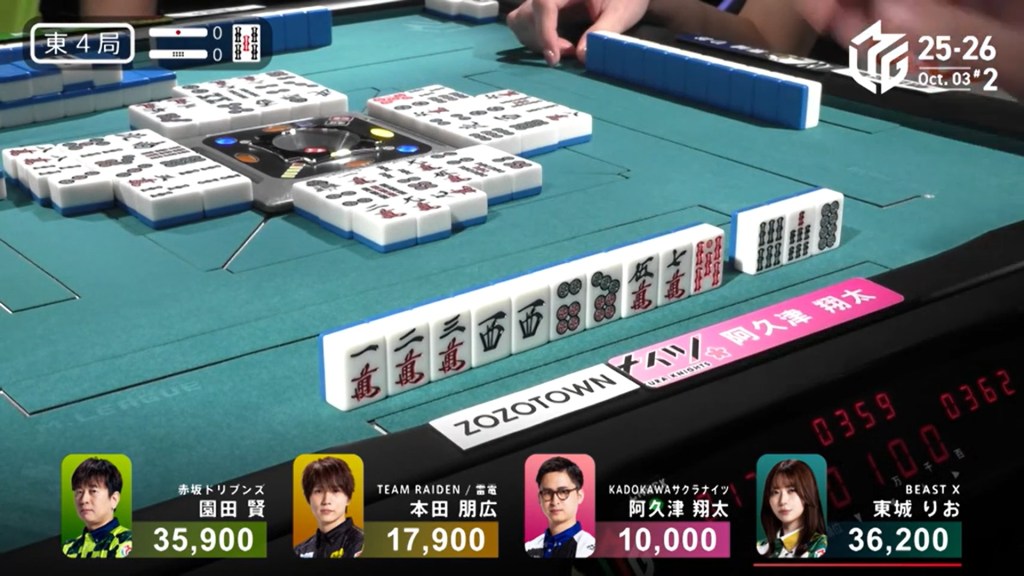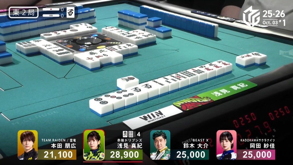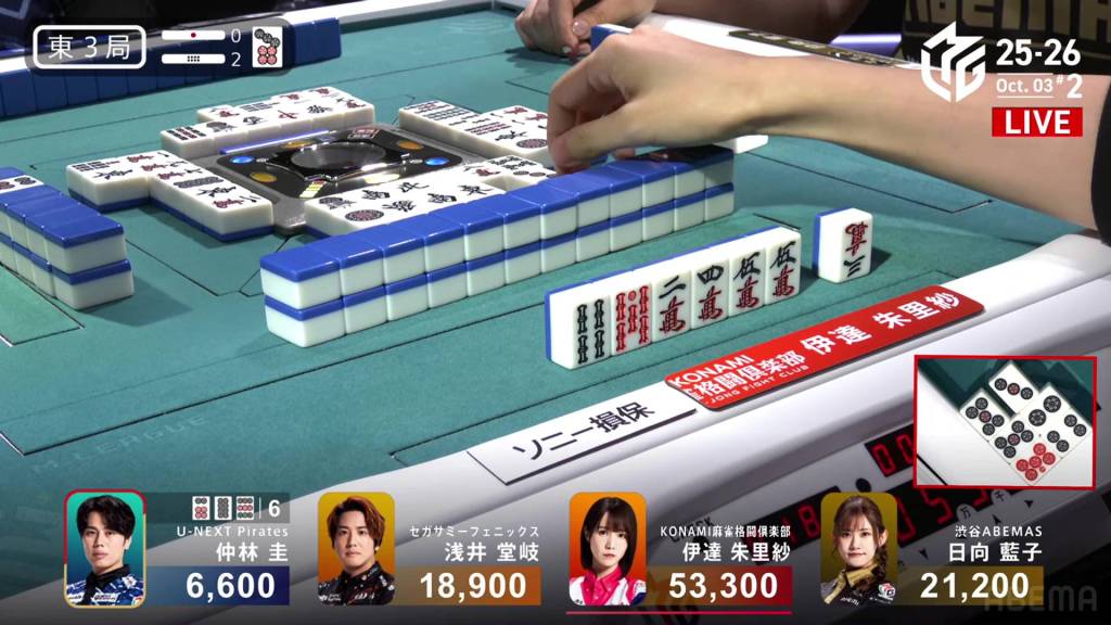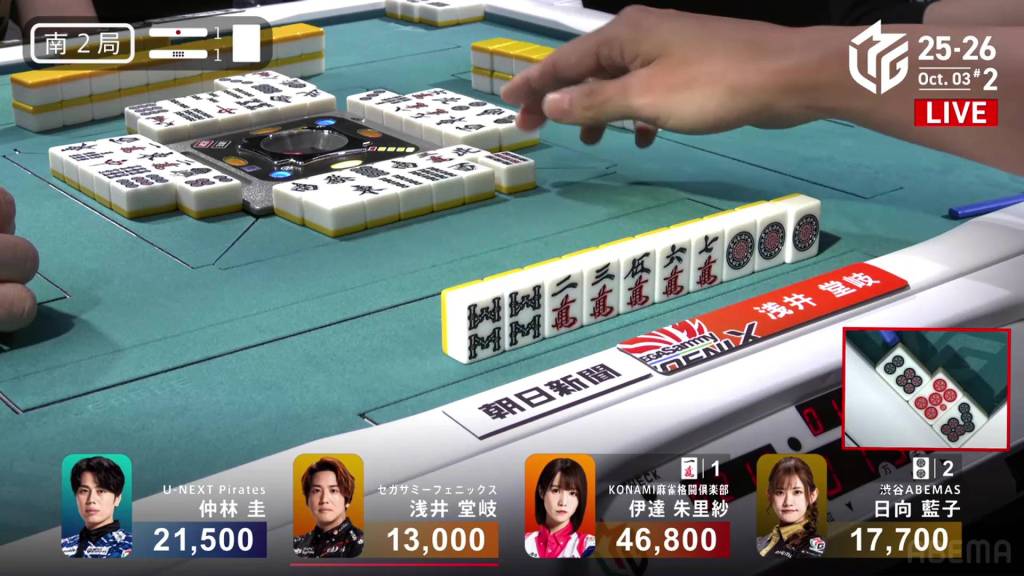 Right after, Akutsu draws the final 6m in the wall and wins the hand. Akutsu wins with Riichi/Ippatsu/Dora 1/Aka 1 for 2,000/4,000, moving up to 3rd.
