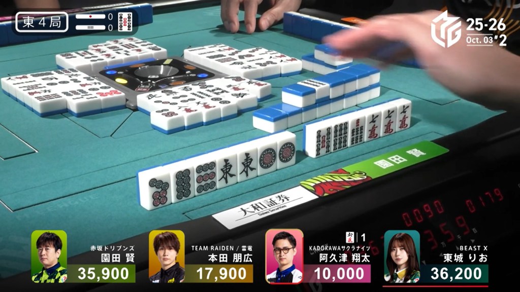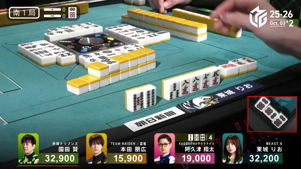 Across from Takaki, Hisato is also at iishanten, having called pon on the green and white dragons. With Takaki’s 6s closed kan in the second row, the 4p becomes the new dora. When the 4p comes out, Hisato calls chii and gets to tenpai on a 25m ryanmen, also guaranteed a mangan.