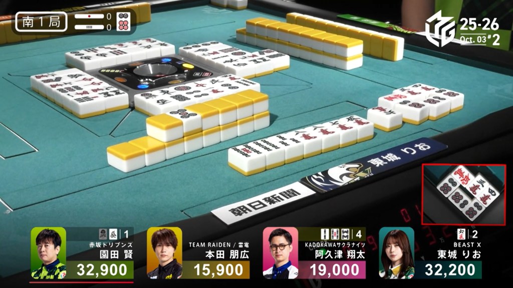 At the same time, Takaki and Hinata call ron. Because of the headbump rule, only Hinata is allowed to win. Hinata wins with Green Dragon/Houtei/Dora 1 for 3,900+300 plus one riichi stick, moving up to 2nd place.