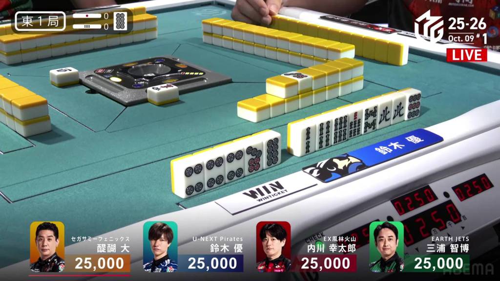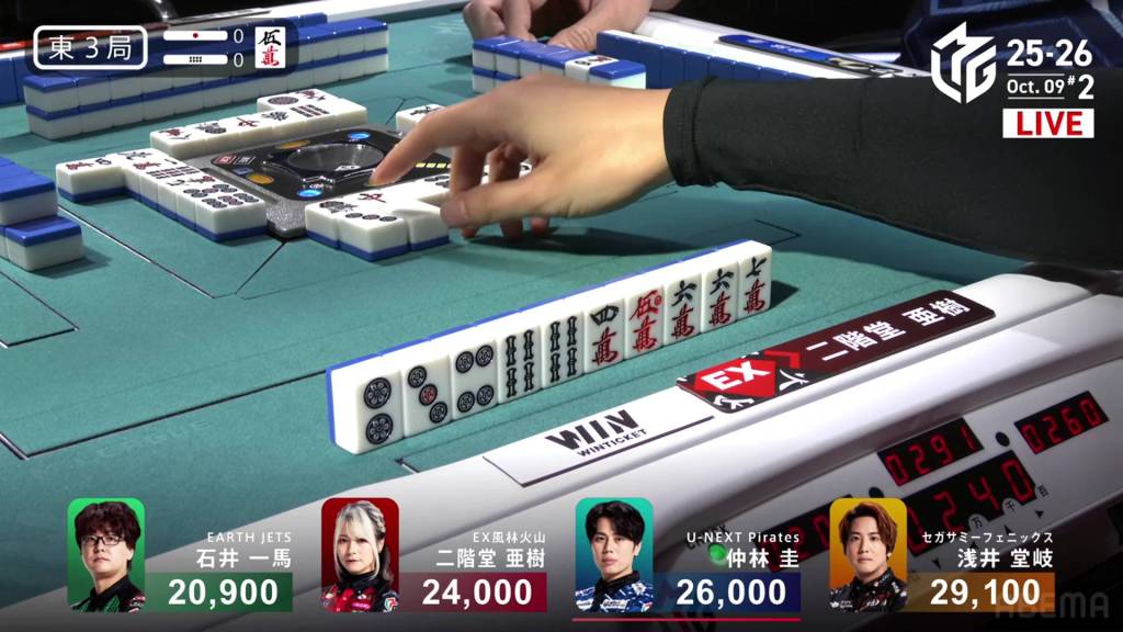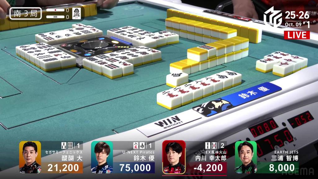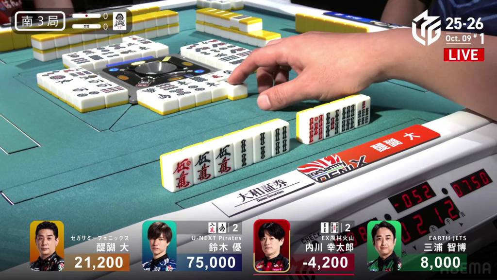 In E3-0, Kazuma is in 4th place, but the game is still close. Sitting 8,200 behind 1st place Takaki, a even a mangan tsumo would be enough to flip his fortunes.