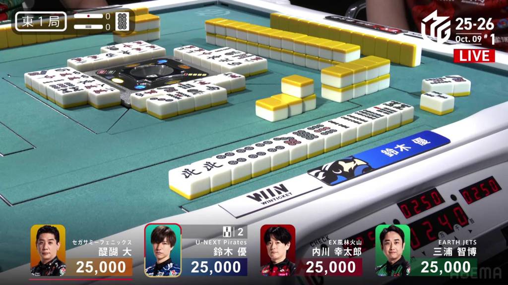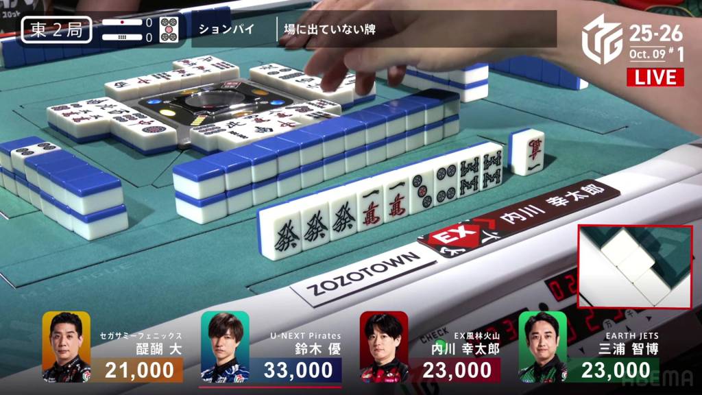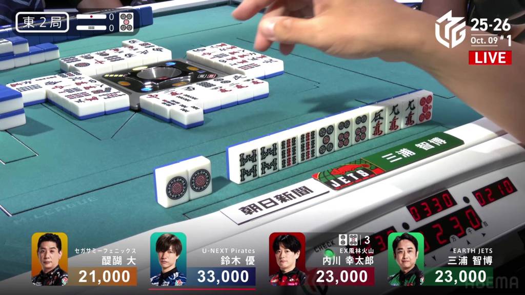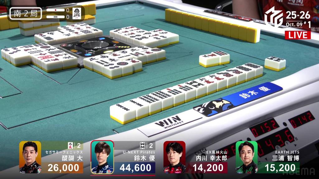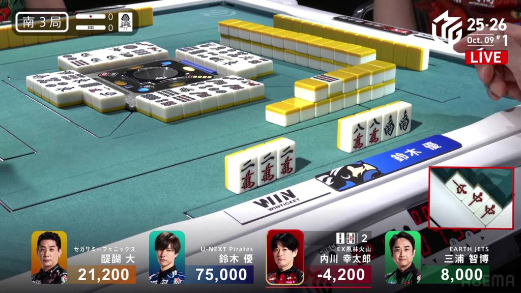 Before Yu even gets his first draw, he calls pon on the red dragon. With his hand also having a pair of souths, he is looking to end the game quickly. However, Uchikawa (who is in 4th place with -4,200) looks to challenge the speed and calls riichi on a 25s ryanmen on turn 3.