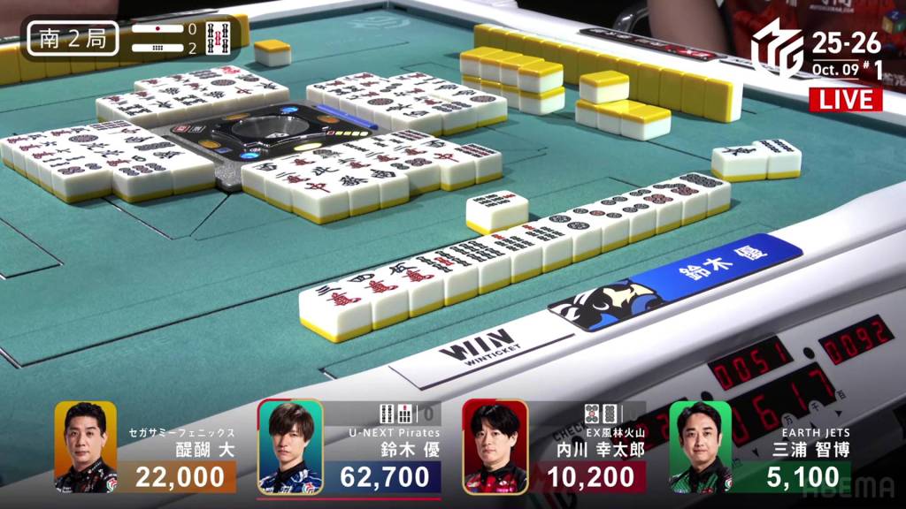 But, within the go-around, Takaki draws the 6s and wins the hand. Takaki wins with Riichi/Tsumo/Pinfu/Aka 2 for 4,000 all plus a riichi stick, jumping to 1st place.