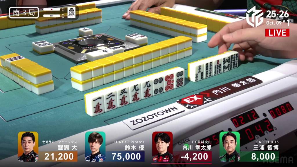 To maneuver around the hand, Yu goes back to 2-shanten, breaking his manzu shape from two blocks to just one. With a combination of honour draws and simple ties, Yu is able to slowly and safely advance. By the middle of the third row, Yu is tenpai and calls riichi on a 47s ryanmen. On the second-last turn, Uchikawa draws and discards the 7s and deals into Yu. Yu wins the hand with Riichi/Pinfu/Tanyao/Dora 1 for 12,000+600 plus a riichi stick, taking Yu up to 76,300.