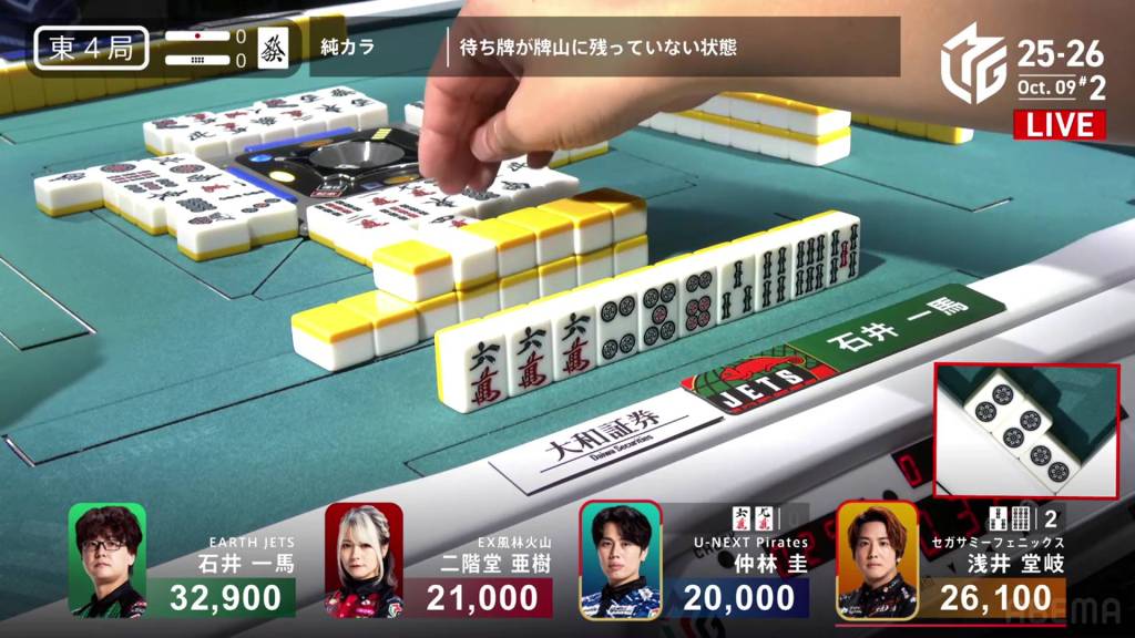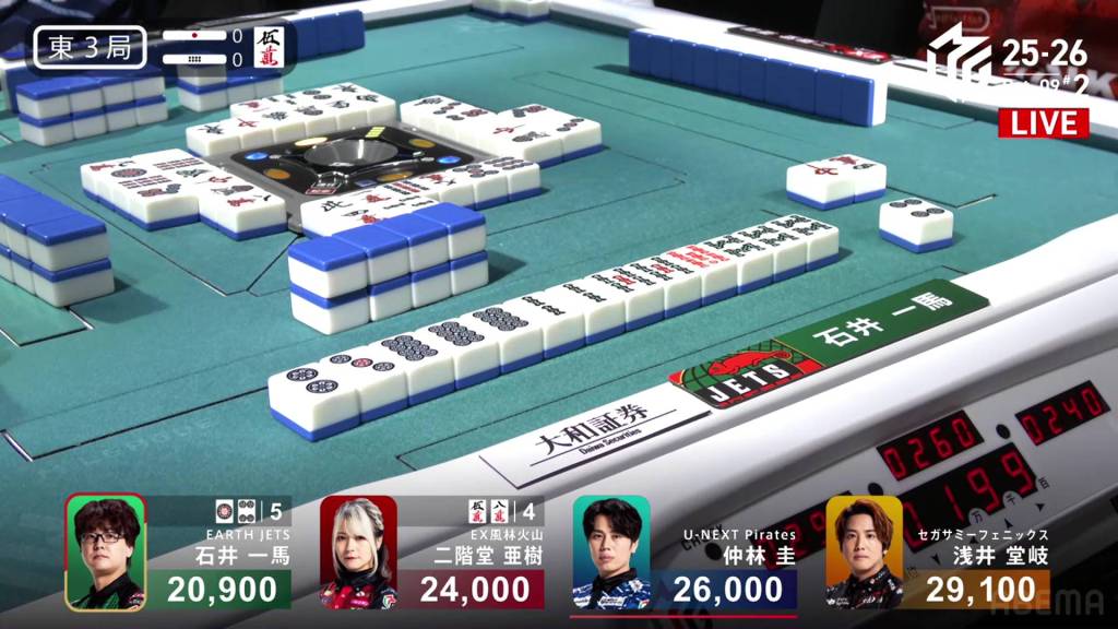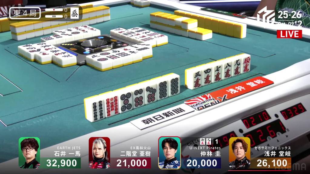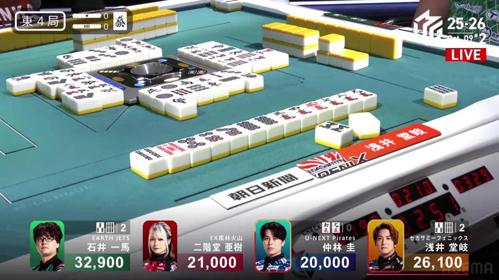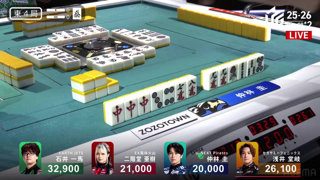 In E4-0, Takaki is the dealer in 2nd place and sits 6,800 behind 1st place Kazuma.