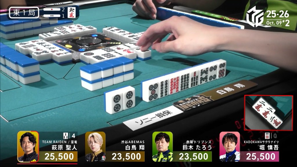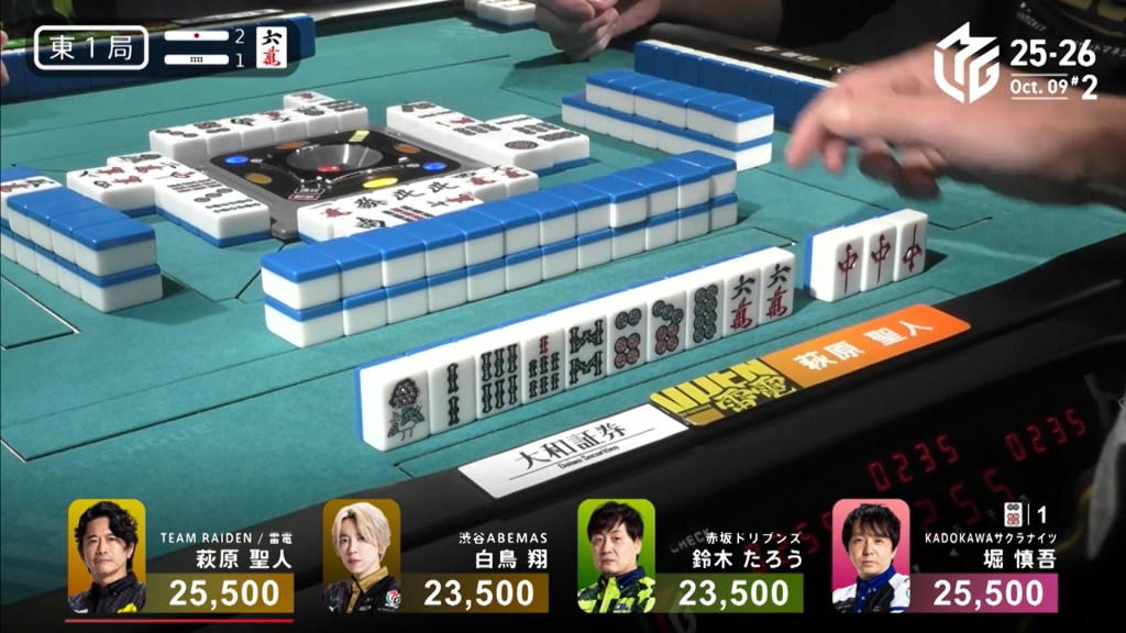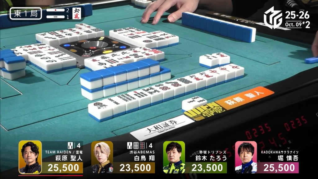 In E1-1, Hagiwara is the dealer in a narrow tie for 1st place after a riichi battle ended in a row. As a result. Two riichi sticks and one honba are in the pot.