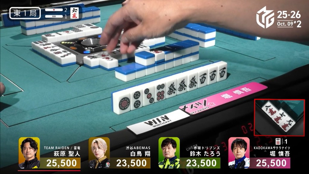 To his left, Hori holds triplets the green dragon and west. With a chii, Hori gets to tenpai on a 6p tanki.