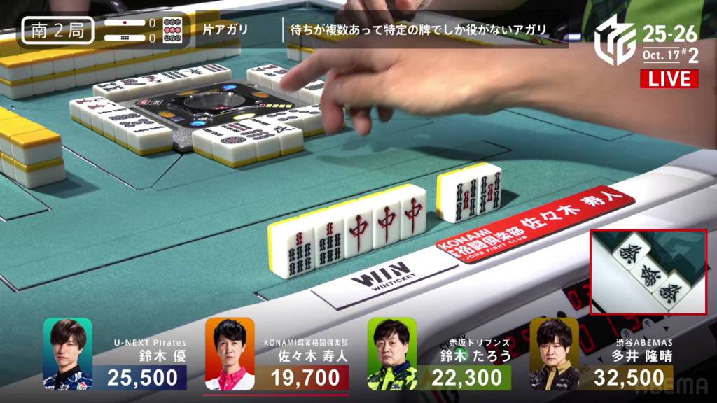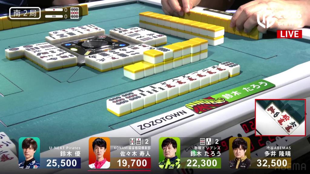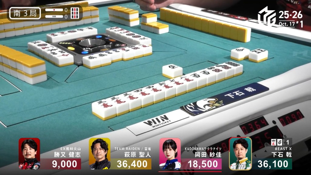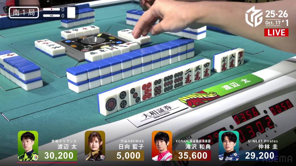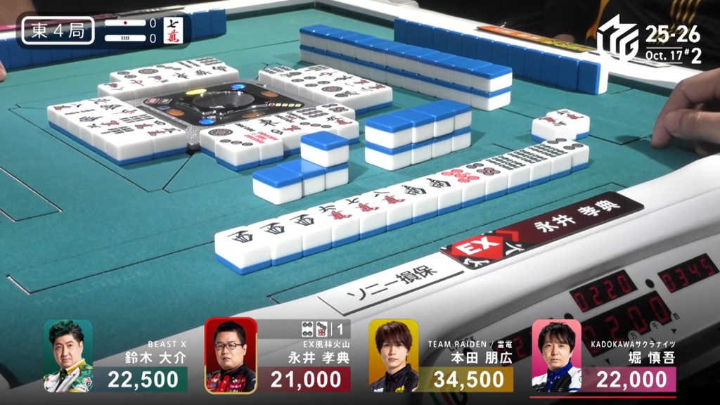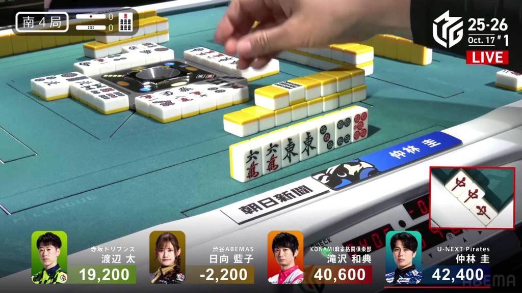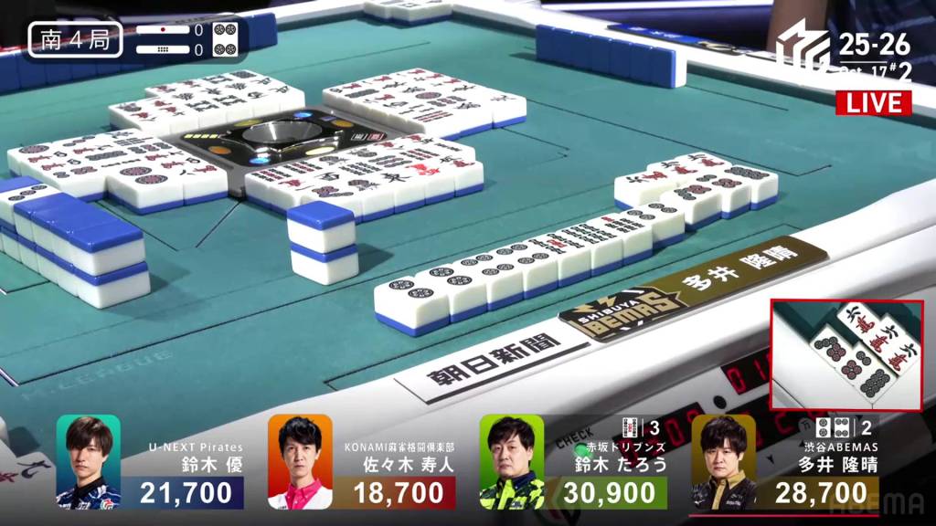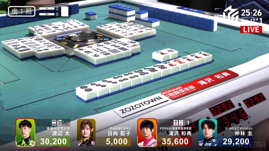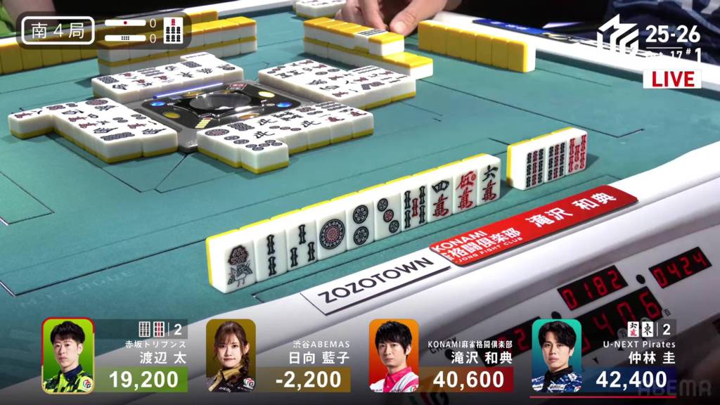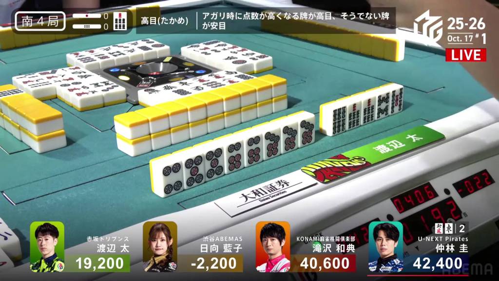 In S4-0, the fight for 1st place is tight, with 1st place dealer Nakabayashi just 1,800 ahead of 2nd place Takizawa. Depending on who wins or who deals in, the person in 1st place can change. Even the dealer penalty or tenpai payments can decide who will be the victor.