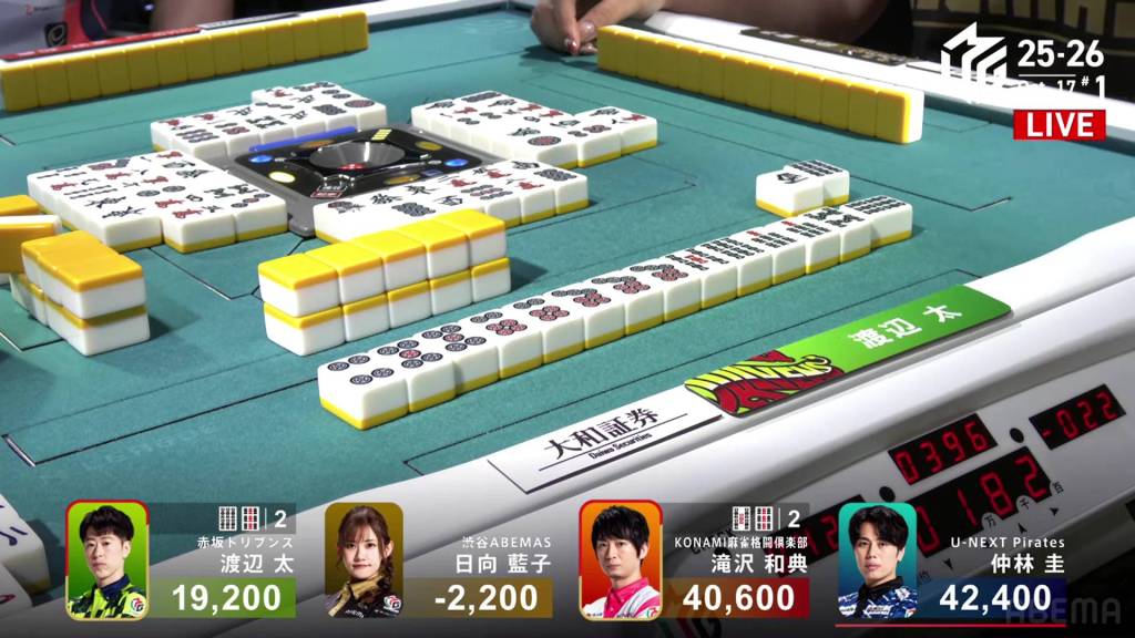 In a similar fashion as the last hand, Nagai draws his winning tile at the end of the second row. Nagai wins the hand with Riichi/Tsumo/Dora 1/Aka 1 for 2,000/4,000, pushing Nagai up to 41,000.