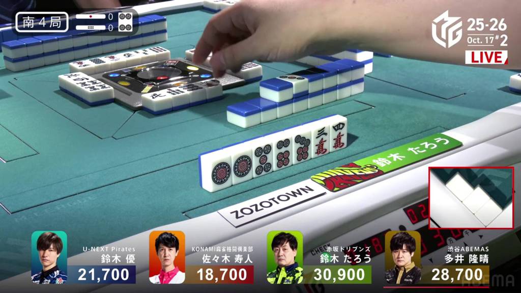 In S4-0, Ooi is the dealer in 2nd place 2,200 behind 1st place Taro. As long as Ooi gets at least 2 han, he will move into the lead.