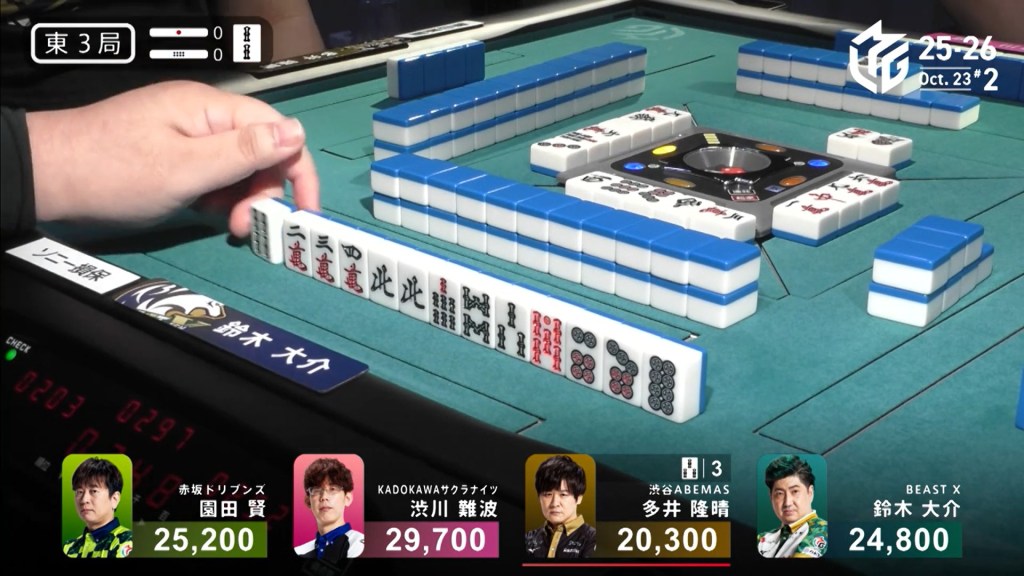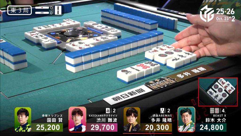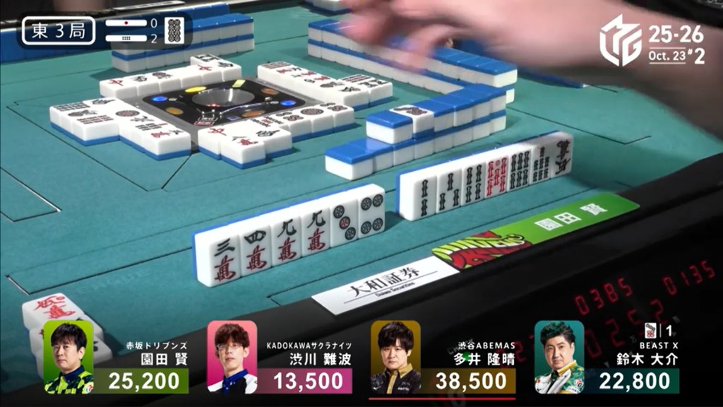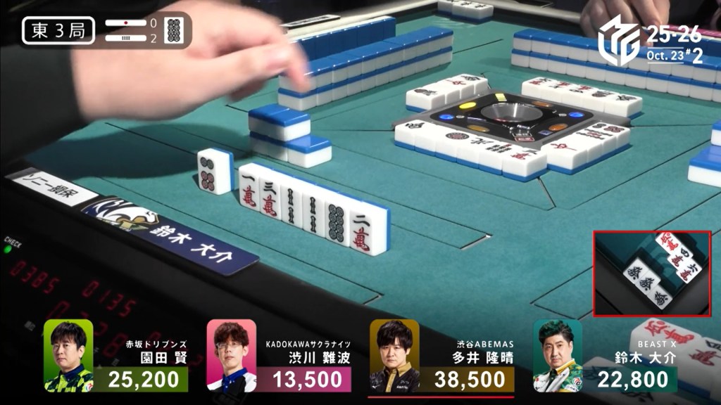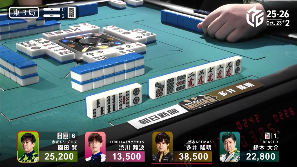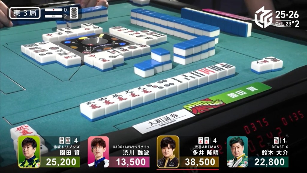 Three player in tenpai, only one can win. On Shibukawa’s next turn, he discards the 3s and deals into Ooi. Ooi wins the hand with Double East/Dora 1/Aka 1 for 12,000 plus two riichi sticks, taking the lead.