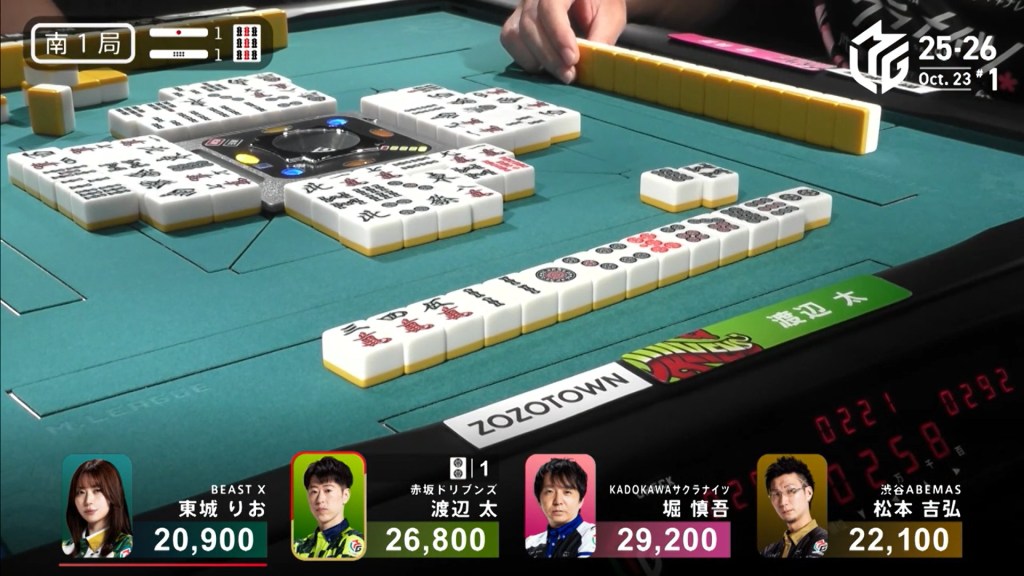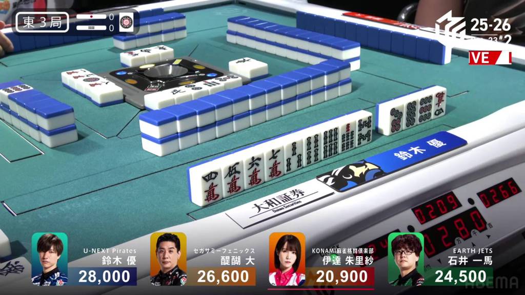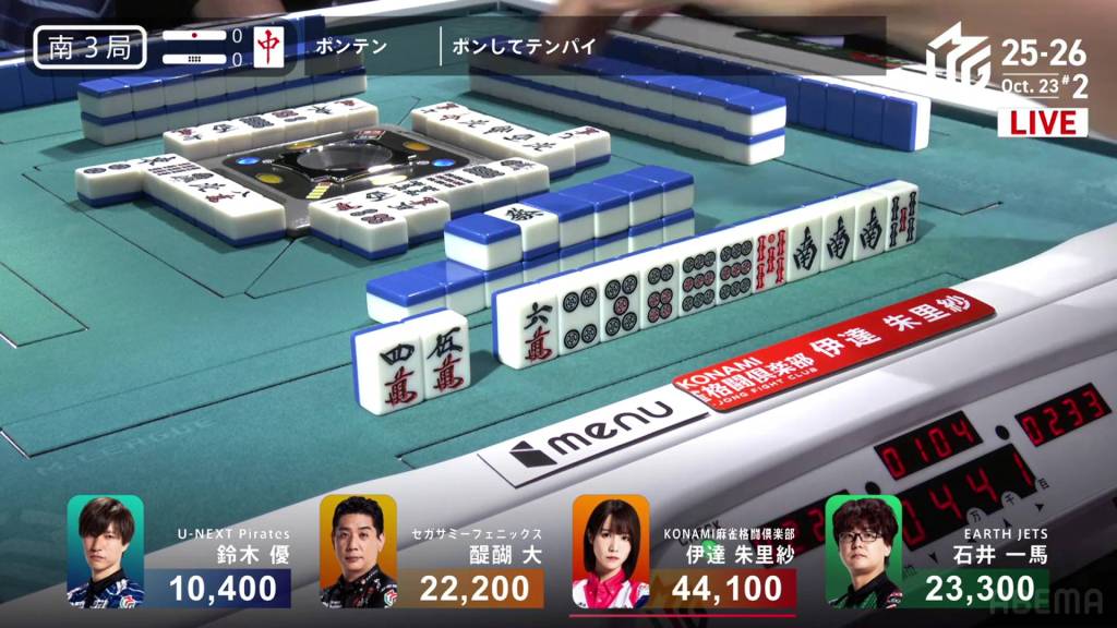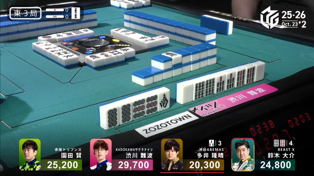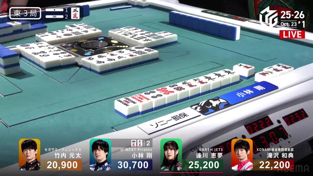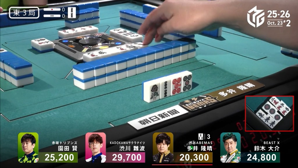 Three player in tenpai, only one can win. On Shibukawa’s next turn, he discards the 3s and deals into Ooi. Ooi wins the hand with Double East/Dora 1/Aka 1 for 12,000 plus two riichi sticks, taking the lead.