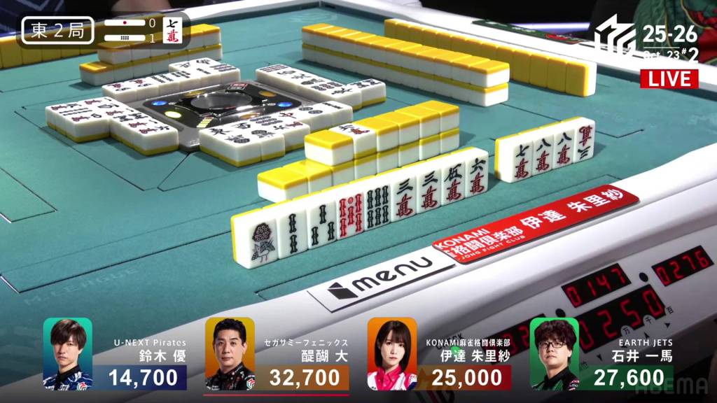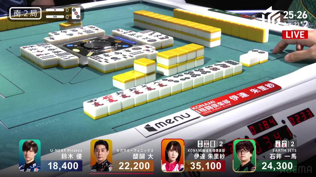 In E2-1, Yu is in 4th place after dealing in two hands in a row. He needs at least a haneman to get above starting.