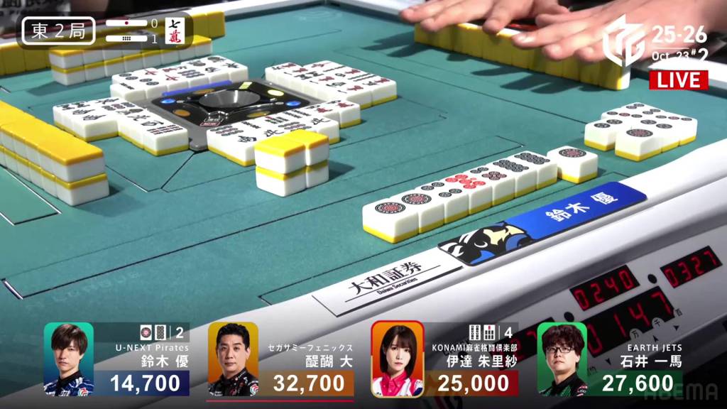 With a lot of folding from the others, it’s a battle between Yu and Date. In the middle of the third row, Date draws the 4p and wins the hand. Date wins the hand with Chinitsu/Dora 2/Aka 1 for a big 8,000 all baiman plus one riichi stick, more than doubling her score.
