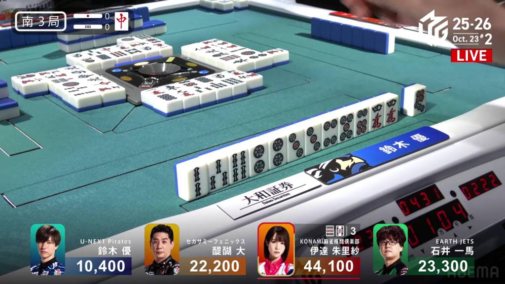 To his left, Daisuke is quickly advancing. Having already called the green dragon and a red 5m for a 456m sequence, Daisuke gets to iishanten. A turn later, he gets to tenpai on a 7p kanchan.