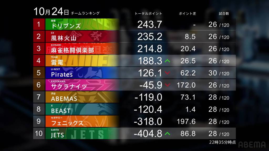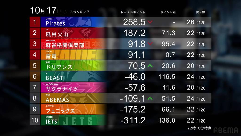 Losing points are the Shibuya Abemas, Beast X, Earth Jets and U-Next Pirates. Despite the Shibuya Abemas getting three 2nds (including a 45,400 result by Shiratori), a 4th place by Ooi and the inability to get 1st pushed the team down in points (but interestingly going up to 6th overall). The Beast X was the best performer at their table on Friday, but a total of three 4ths during the week hurt them and pushed the team down two places to 8th. The Earth Jets continue to struggle and got net negative results on all three days they played, pushing them below the -400.0pts mark. And with the U-Next PIrates, the team had quite a drop after a double 4th on Friday, cutting their score down in half and going from the top of the standings to 5th place.