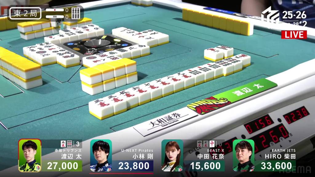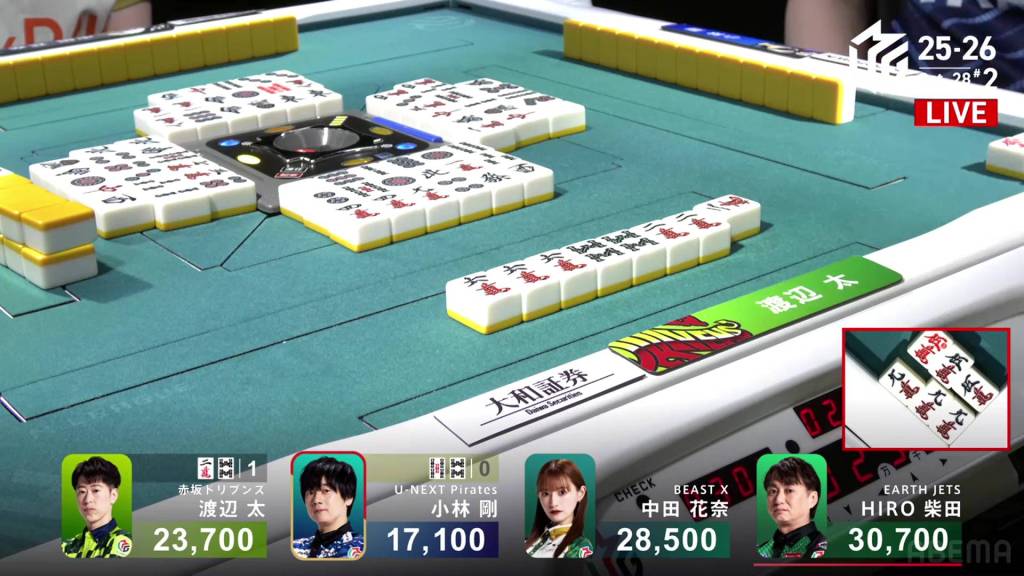 From the start, Shibata is 2-shanten with a pair of the 5m dora (including the red 5m), a three-sided wait in pinzu and a pair of souths. On turn 4, he calls pon on the souths to secure a yaku. Two turns later, he calls a 234m chii and gets to tenpai on a 258p three-sided wait. Within the go-around, Nakabayashi discards the 2p and deals into Shibata. Shibata wins the hand with South/Dora 2/Aka 1 for 12,000.