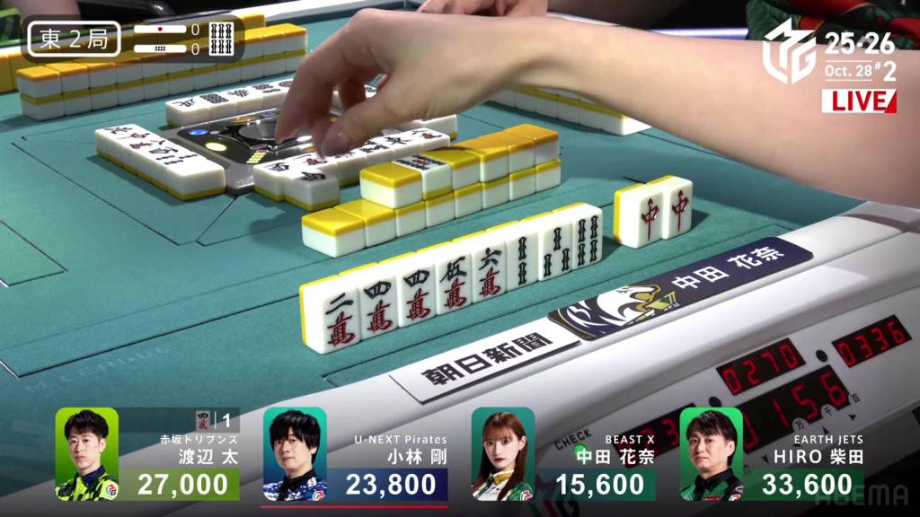 While Futoshi does that, 4th place Nakada is 2-shanten and needs to fill in a 3s kanchan, a 3p kanchan and a 3m kanchan. At the end of the first row, she draws the 3s for iishanten. Within the go-around, she calls a 234p chii and gets to tenpai on a 3m kanchan.