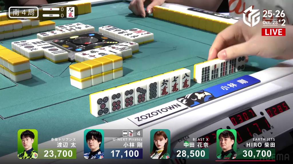 In S4-0, Futoshi is in 3rd place, 4,800 behind 2nd place Nakada and 7,000 behind 1st place dealer Shibata. To take 1st place, Futoshi needs a 3/40 direct hit or tsumo (including a 4/20 tsumo), or a mangan ron.